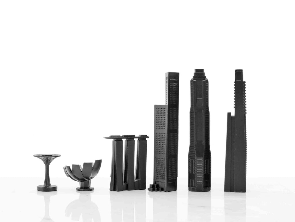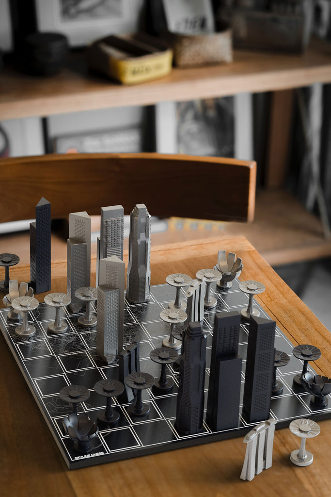 - Stainless steel chess pieces inspired by iconic skylines worldwide.