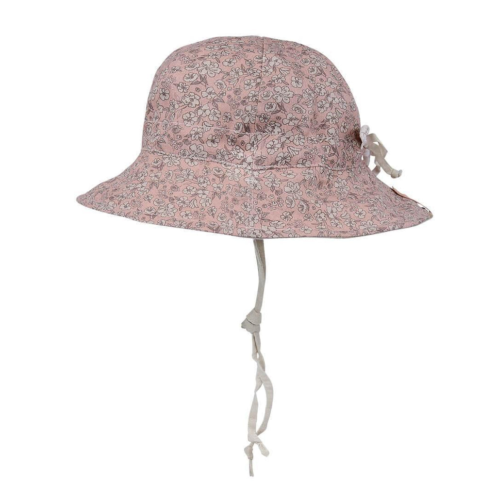 Simple Beige Blooms On A Dusky Pink Background Florence Is A Great Girlie Neutral. The Beautiful Stone Colour Of Flax On The Reverse Means It Will Go With Alllll The Outfits. Florence Is Available In Flap Hat Bonnet Panelled Bucket And Ladies Sun Hat.