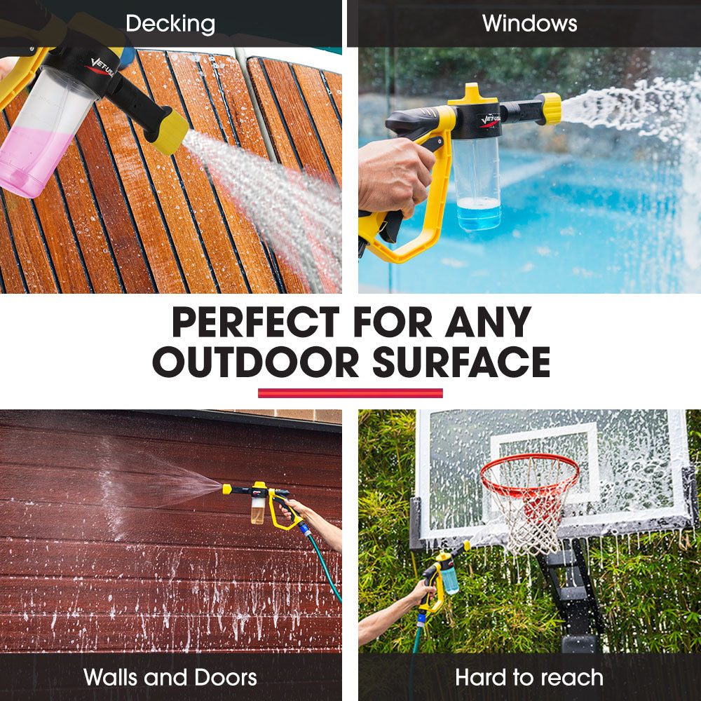 The Jet-USA Foam Gun Ensures Complete Coverage. The Easy-To-Use Design Makes Producing And Applying Foam Soap And Other Cleaning A Breeze. The Wide-Mouthed Neck Facilitates Easy Filling. Enjoy A Smooth And Consistent Application The Quick-Fit Connector Fits All Standard Garden Hose Connectors.