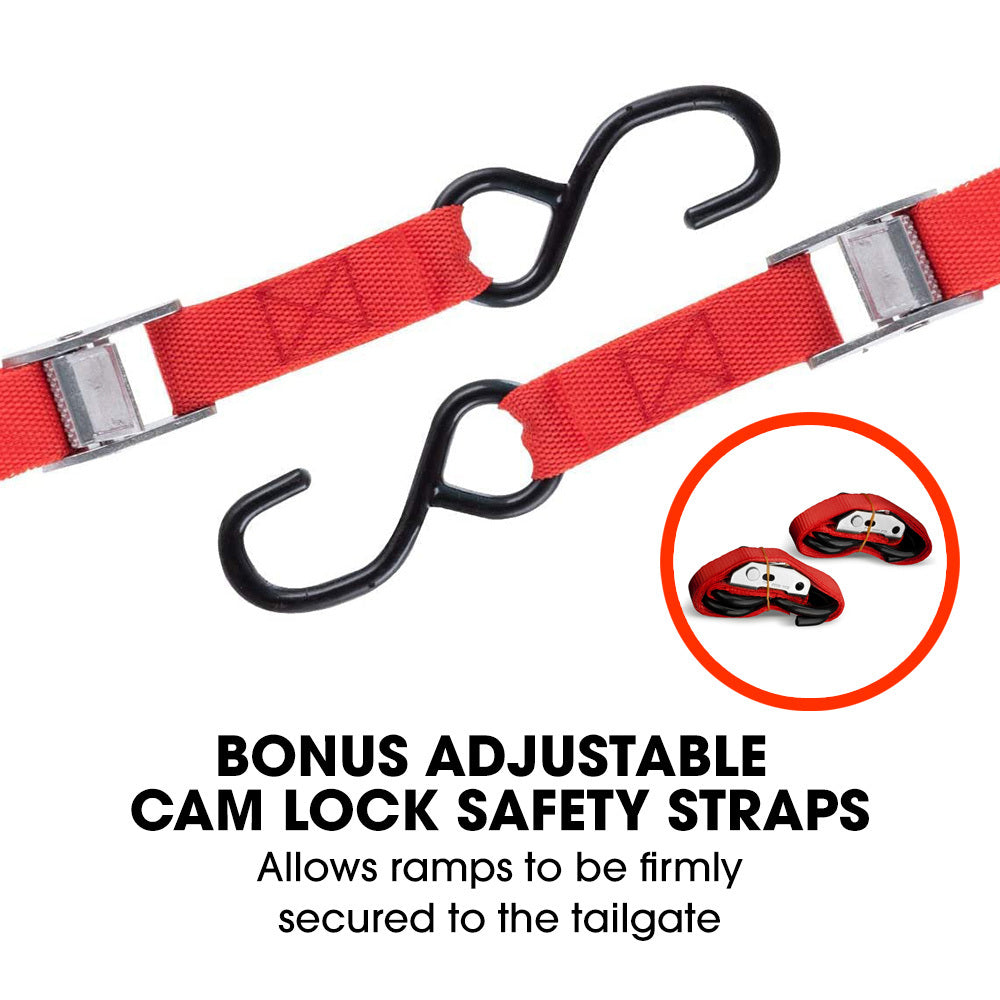 Bonus length Safety cam lock straps ensure the ramps are firmly attached to the tailgate while the anti slip design reduces the risk of vehicles rolling backwards. Making them perfect for safely loading a variety of two and four wheel vehicles and equipment.