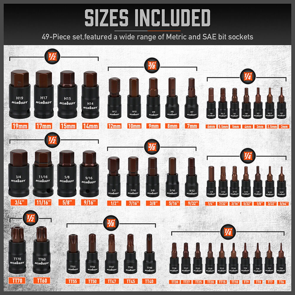 Complete Kit- This Comprehensive Set Includes T6-T70 Star Bits E4-E24 E-Torx And Both Metric And Sae Hex Socket Bits Providing The Perfect Tools For Any Task Whether Using A Driver Wrench Or Ratchet.