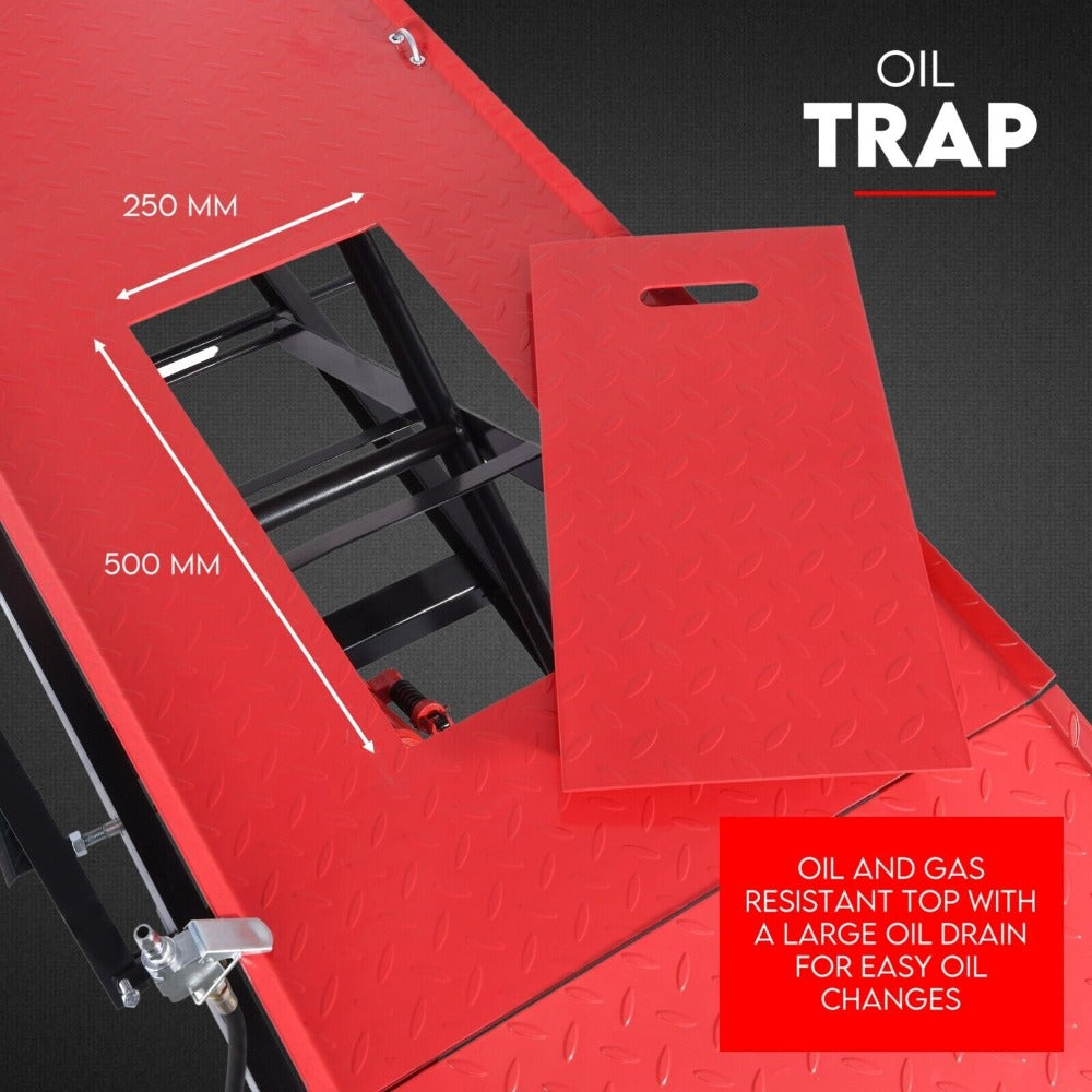 Many repair shops use this to lift the vehicle up. Useful to mechanics they don't put any strain on his back or lay on the ground to perform the repairs. The capacity hydraulic lift is rated at 1100lbs.