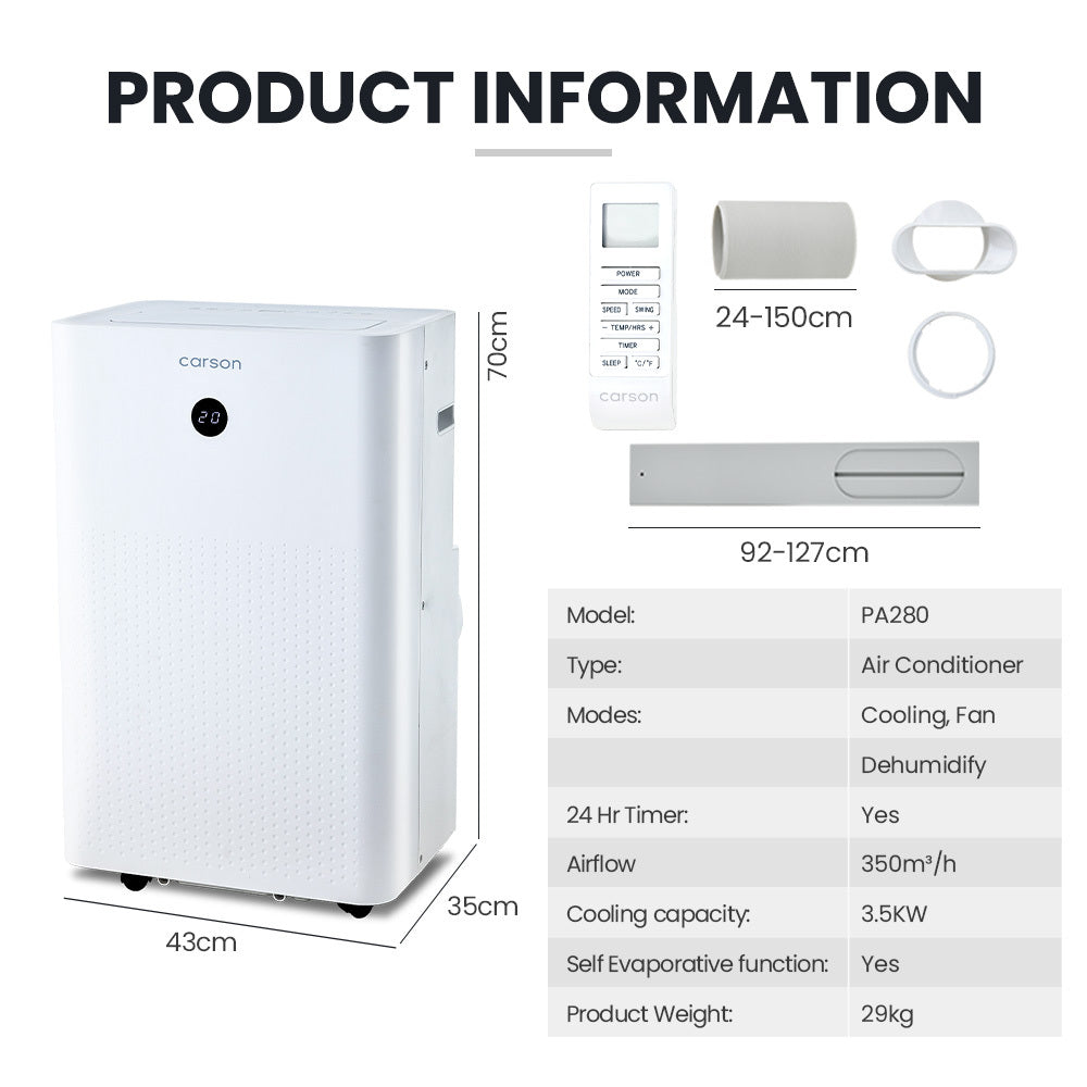 Keep Your Home Comfortable With The Carson Pa280 Air Conditioner. Just Sit Back Relax And Use The Remote Control To Adjust The Temperature From The Comfort Of Your Lounge. This Compact Unit Is Ideal For Cooling Rooms Of Up To 25 Square Metres.