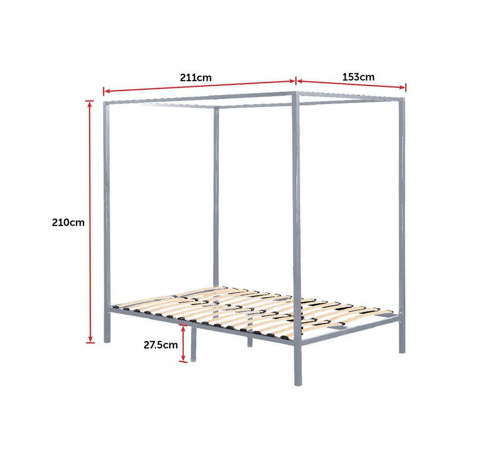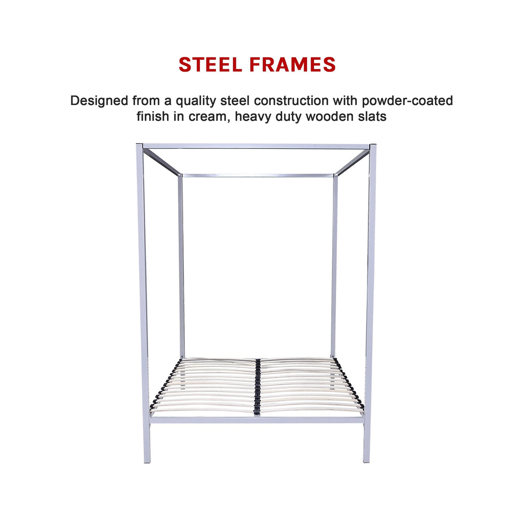 P>The Bed's Sleek Cream Frame Is Trendy And Modern Making It A Perfect Choice For The 21St Century Home. But If You Prefer A More €˜Old-Style' Romantic Look Its Modest Design Means That It Is Easily Dressed With Drapes In Order To Achieve The Style You Want. What's More The Frame's Neutral Cream Allows It To Fit In With Any Colour Scheme - Versatility At Its Best.P>As It Is Queen Size The Bed Has Plenty Of Space Providing The Luxurious Comfort That You Deserve After A Long Day. The Bed's Fifteen Slats Provide Flawless Support For A Queen Mattress Without The Need For Any Additional Foundation.P>It Is Also An Ideal Choice For Those Who Want A Sturdy Four-Poster Bed That Will Last. It's Strong Metal Frame And Side Rails Guarantee That It Is Both Stable And Durable.P>Whatever Your Design Scheme This Bed Has All The Desirable Features Of A Four-Poster Bed €“ A Purchase You Won't Regret.P>Specifications:Ul>Li>Steel Construction With Powder-Coated Finish In CreamLi>Post Leg Diameter: 30301.0Mm Height: 27.5CmLi>Bed Base Crossbar And Side Rails: 30 X 40 X 1.00 MmLi>Steel Tube On The Four Corners: 40 X40 X 1.2MmLi>Assembled Dimensions: 153Cm X 211Cm X 210CmLi>Fits Standard Australian Sized Queen Mattress Of 153Cm X 203Cm Not IncludedLi>Weight Capacity: 300KgLi>Assembly Required/Ul>P>Note: Colour Is Cream / Off White.P>Attributes:- Size: Queen