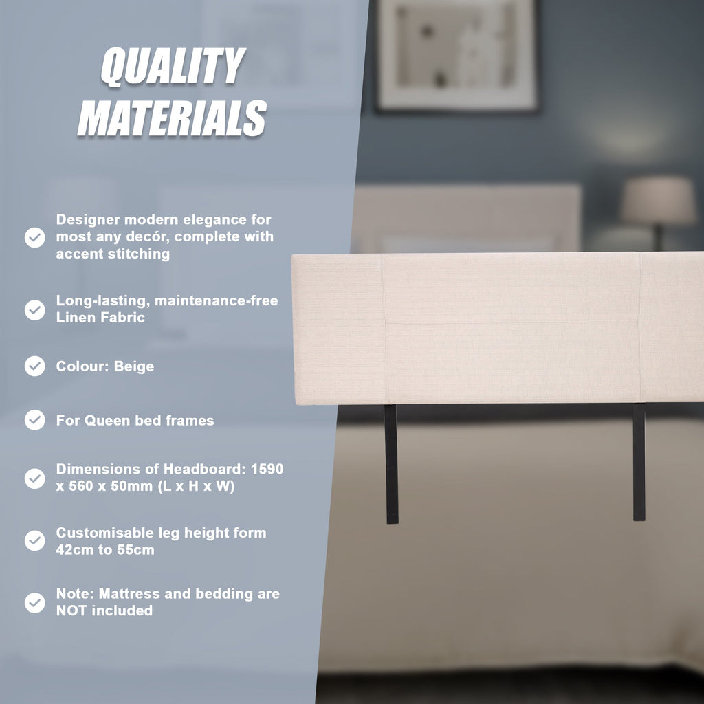 Br> This Headboard For Standard Queen-Sized Bed Frames Is Created With Quality Materials Including Easy-To-Maintain Linen Fabric That Will Maintain Its Sophisticated Look For Many Years To Come. This Particular Model Comes With Elegant Stitching Accents That Provide Just The Right Level Of Understated Pop. A Neutral Beige Will Blend Seamlessly With A Wide Variety Of Bed Frames And Other Bedroom Furniture.