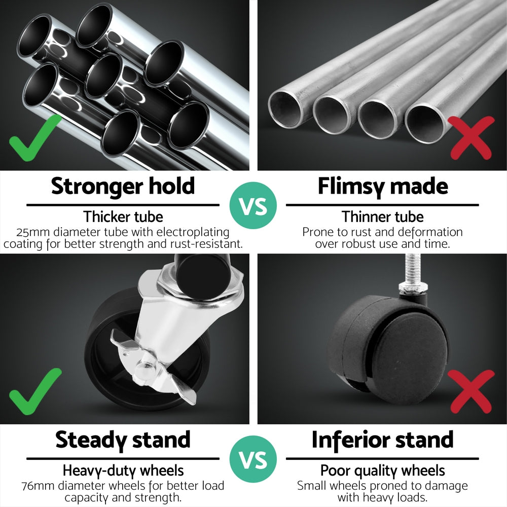 Keep Your Wardrobe Neat And Accessible With The Artiss Heavy Duty Clothes Rack. Designed For Durability And Functionality This Rack Features A Corrosion-Resistant Metal Frame That Supports Everything From Coats To Dresses. With A Smooth Electroplated Finish And 360° Swivel Casters It’S Easy To Move Around Any Space. The Extendable Horizontal Rod Accommodates Various Clothing Sizes And The Collapsible Design Makes Storage Simple When Not In Use. Ideal For Renters Retail Displays Or Home Organization!