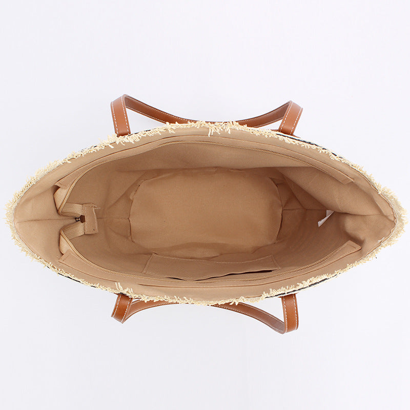 Elosung Black And Brown Stripes Handmade Large Capacity Striped Beach Tote Bag With Zipper Inner Pocket Summer Vacation Woven Shoulder For Women Women