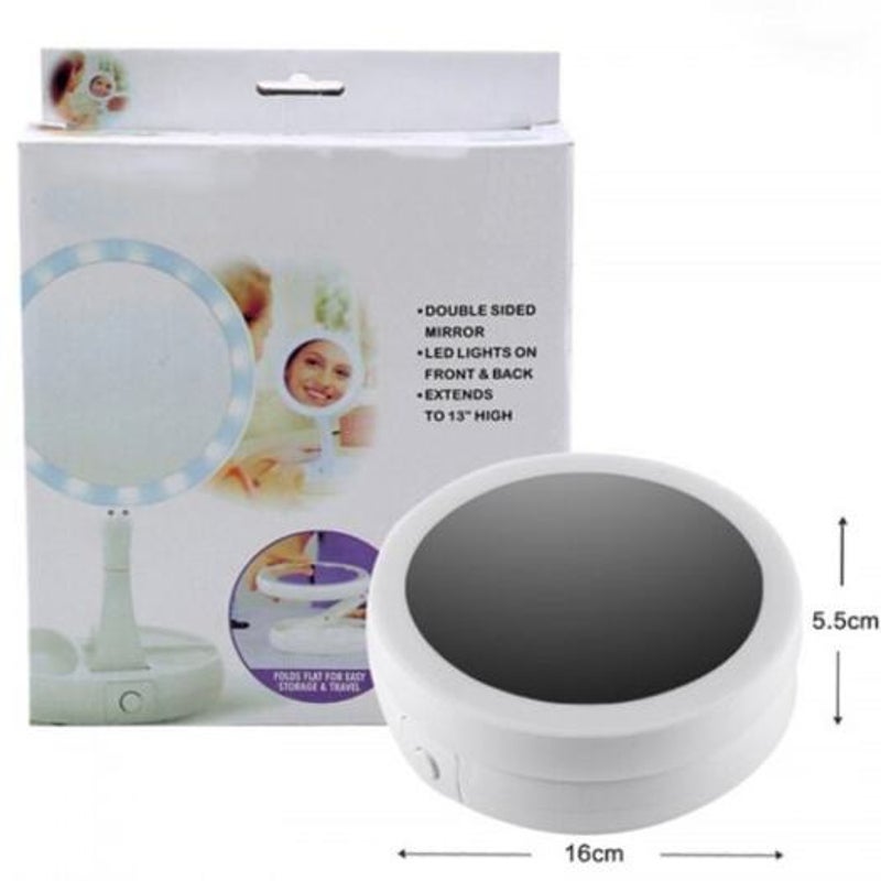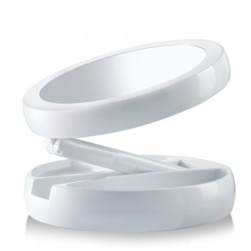 My Foldaway Mirror Is A Double-Sided Illuminated Vanity Mirror. It Has A Powerful 10X Magnification. Folds For Easy Use And Storage. Super Bright Led Lights On Both Sides For Perfect Image Illumination. This 1X Mirror Rotates To A Powerful 10X Magnification Mirror. It Has A Built-In Organizer For Accessories. It Is Lightweight And Compact For Travel. The Mirror Is Sharp Clean And Distortion Free.