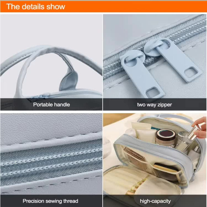 H1>Premium Pu Leather Makeup Bag P>Perfectly Designed For Both Short Trips And Extended Travel This Large-Capacity Cosmetic Bag Is Your Ideal Organizing Companion. Featuring A Soft Pu Leather Exterior It Provides A Luxurious Touch While Ensuring Durability And Water Resistance. The Multiple Compartments Make Organizing Your Essentials A Breeze And The Sleek Design Adds A Touch Of Elegance To Your Journey. H3>Product Features: Ul> Li> Material: High-Quality Pu Leather For A Smooth Waterproof And Durable Finish. Li> Dimensions: 25Cm (L) X 16.5Cm (H) X 10.5Cm (W). Li> Weight: 225G Lightweight For Easy Portability. Li> Design: Features A Transparent Inner Pouch For Storing Smaller Items Like Eyeshadows And Brushes. Li> Storage: Main Compartment Accommodates Up To 400Ml Tall Bottles Of Skincare Products. Li> Waterproof Divider: Includes A Moisture-Proof Panel To Keep Remaining Powder From Brushes Clean And Organized. /Ul> H3>Why Choose This Makeup Bag P>This Cosmetic Bag Is Not Just Functional But Stylish. Whether You're Heading Out For A Weekend Getaway Or Organizing Your Makeup Essentials At Home It Provides Ample Space And Keeps Everything Secure And Organized. Its Lightweight Build Ensures You Won't Feel Weighed Down While The Waterproof Pu Leather Adds A Layer Of Protection To Your Valuable Items. H3> P> Ul> /Ul> H3> P> P>
