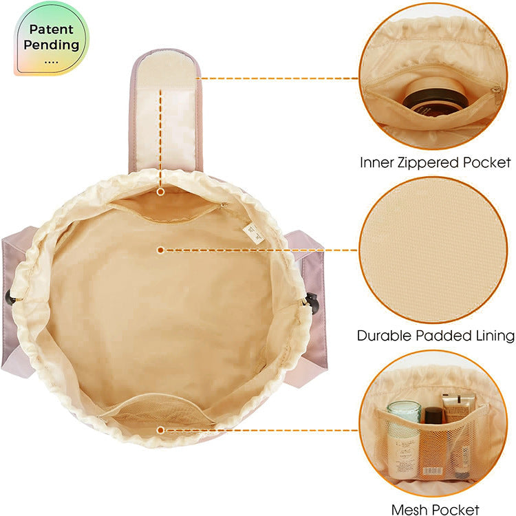Title>New Large Capacity Drawstring Cosmetic Bag Div> H1>New Large Capacity Drawstring Cosmetic Bag - Stylish Travel Toiletry Organizer With Makeup Brush Storage Div> H2>Large Capacity Design P>Dimensions: 11.4 Inches 29 Cm In Diameter And 5.9 Inches 15 Cm High. The Spacious Interior Can Accommodate A Variety Of Cosmetics And Toiletries. /Div> Div> H2> Drawstring Closure P>Features A Convenient Drawstring Closure For Quick Access And Secure Storage Of Your Items. /Div> Div> H2>Durable Padded Lining P>The Interior Is Lined With Durable Padding To Protect Your Cosmetics From Bumps And Scratches. /Div> Div> H2>Inner Zippered Pocket P>An Inner Zippered Pocket Provides Additional Storage Space For Small Valuables Such As Lipsticks Or Earrings. /Div> Div> H2>Mesh Pocket P>A Mesh Pocket Allows You To Organize Different Types Of Items Neatly And Keep Them Easily Accessible. /Div> Div> H2>Patent Pending Design P>This Cosmetic Bag Features A Unique Design That Is Currently Pending Patent Approval Ensuring Its Exclusivity And Practicality. /Div> Div> H2>Ideal For Various Occasions P>Whether For Daily Use Or Travel This Stylish Cosmetic Bag Meets All Your Needs. Its Fashionable Design Also Makes It An Ideal Gift. /Div> Div> Warning: Please Ensure All Items Are Securely Stored Before Traveling To Prevent Spills Or Damage. /Div> H3> P> H3> P> Ul> /Ul> /Div>