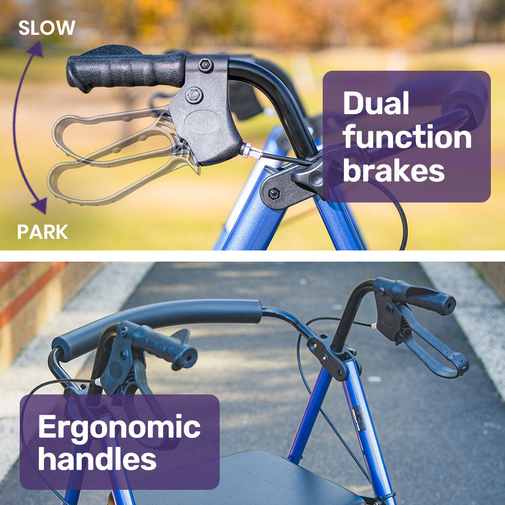 With Dual-Action Braking And Parking Handbrakes Handle Height Ridged Grips Padded Seating And A Padded Contoured Backrest Your Equipmed Rollator Offers Great Ergonomics And Comfort.