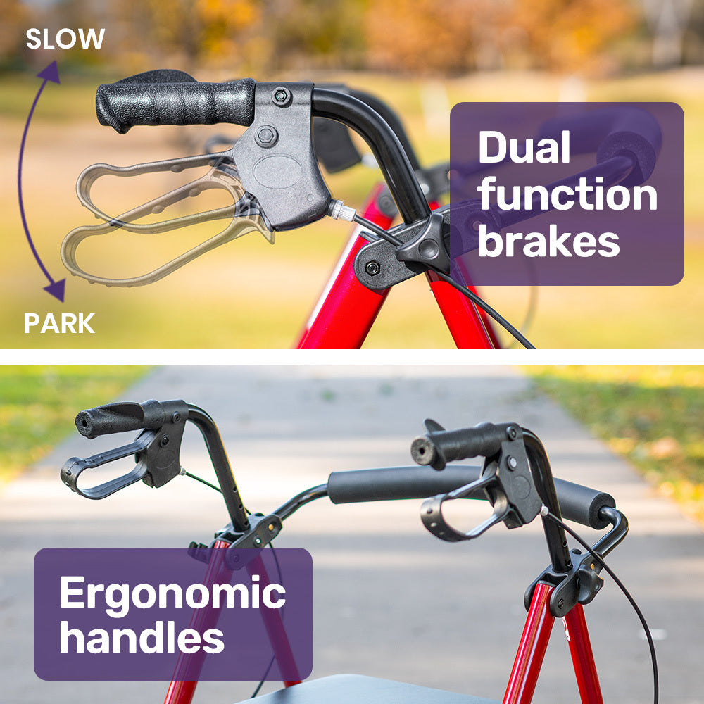 With dual-action braking and parking handbrakes handle height ridged grips padded seating and a padded contoured backrest your Equipmed rollator offers great ergonomics and comfort.