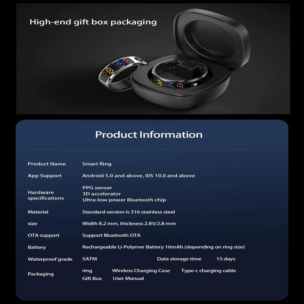 • 1 X Smart Ring (Size 9) – Supports Heart Rate Blood Oxygen Sleep And Sports Monitoring