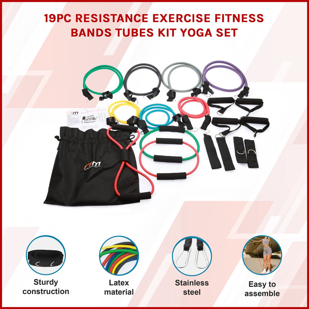 19Pc Resistance Exercise Fitness Bands Tubes Kit Yoga Set Resistance Trainers