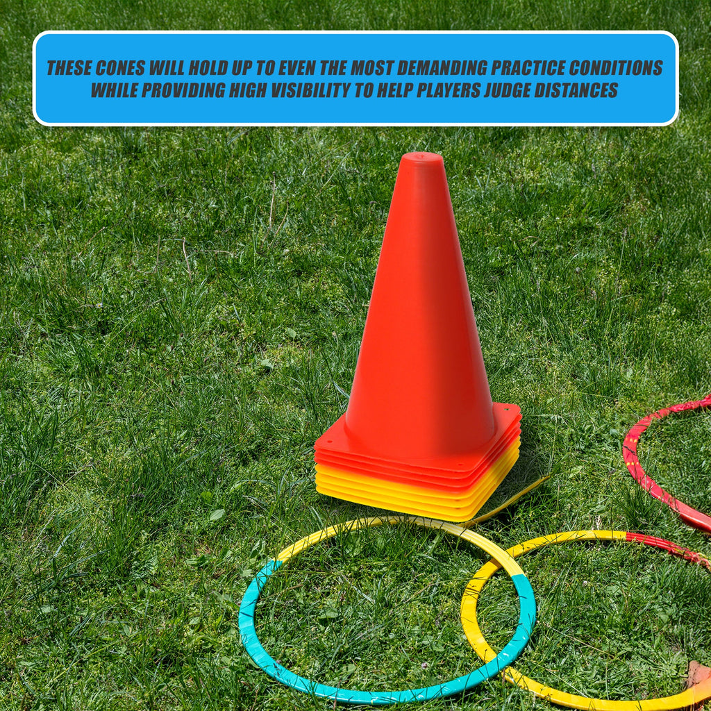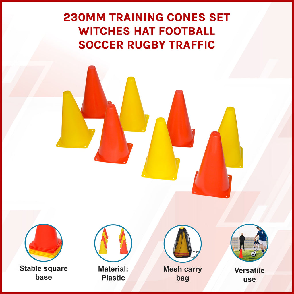 P>In Bright Colours With Stable Square €˜Witch's Hat' Bases These Cones Will Hold Up To Even The Most Demanding Practice Conditions While Providing High Visibility To Help Players Judge Distances.P>Whether You're A Coach Or A Player You'll Appreciate The Bonus Mesh Carry Bag. No Awkward Lugging Cones Around To The Car Or Back To The Locker Room. Just Stack Them Put Them In The Bag And Go.P>Package Includes 4 X Yellow And 4 X Orange Cones.
