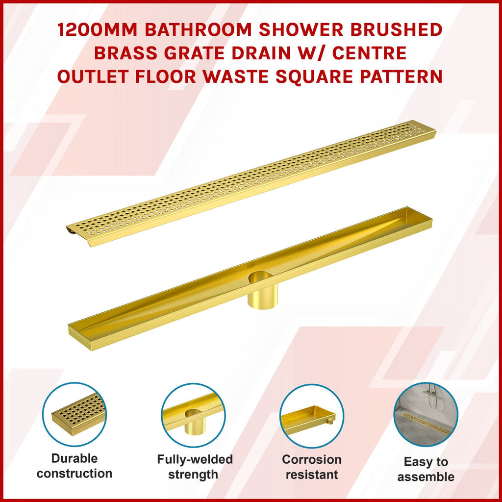 1200Mm Bathroom Shower Brushed Brass Grate Drain W/ Centre Outlet Floor Waste Square Pattern