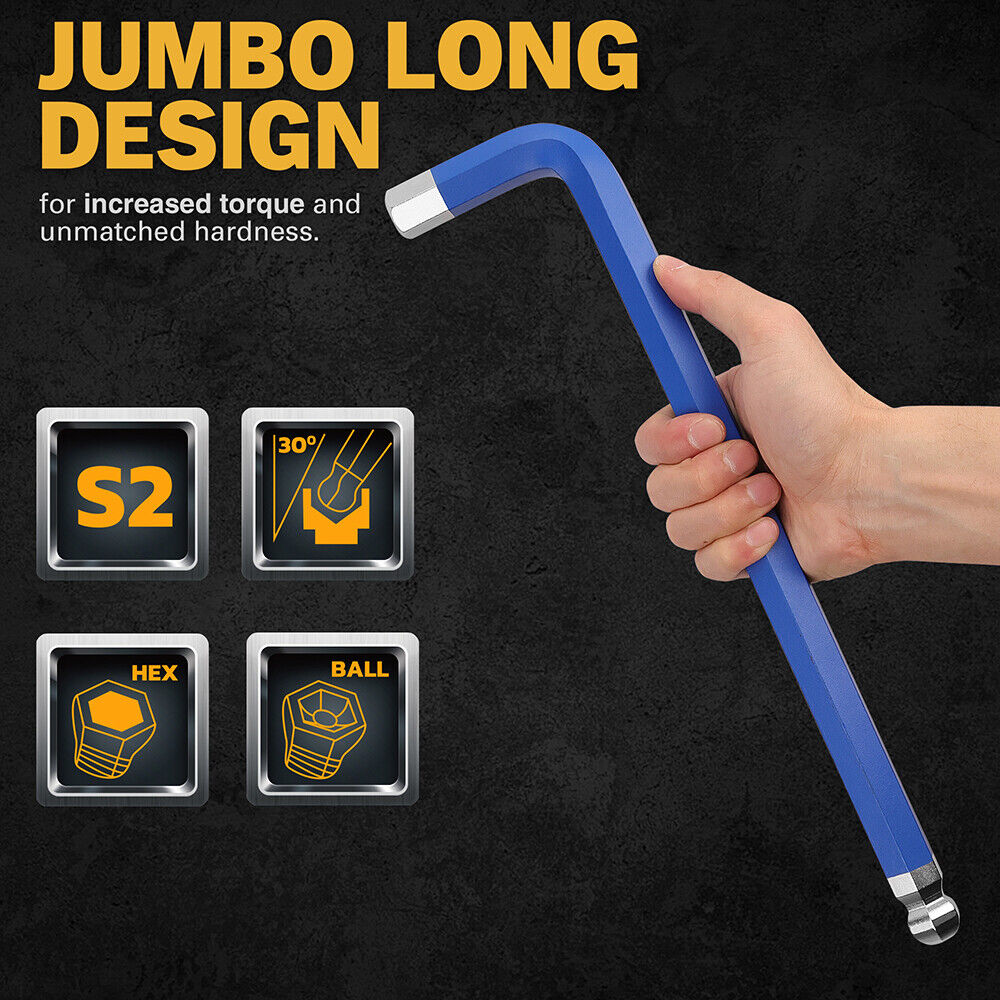COMPLETE SET The 13 Piece Metric Jumbo Long Point Hex Key Wrench set is your comprehensive toolkit for all tightening and loosening needs. With sizes 2mm 2.5mm 3mm 4mm 5mm 6mm 7mm 8mm 10mm 14mm 17mm 19mm this set allen hex wrench keys fit a wide range of internal tools and sockets. Its long arm design ensures easy access to bolts in tight spaces.