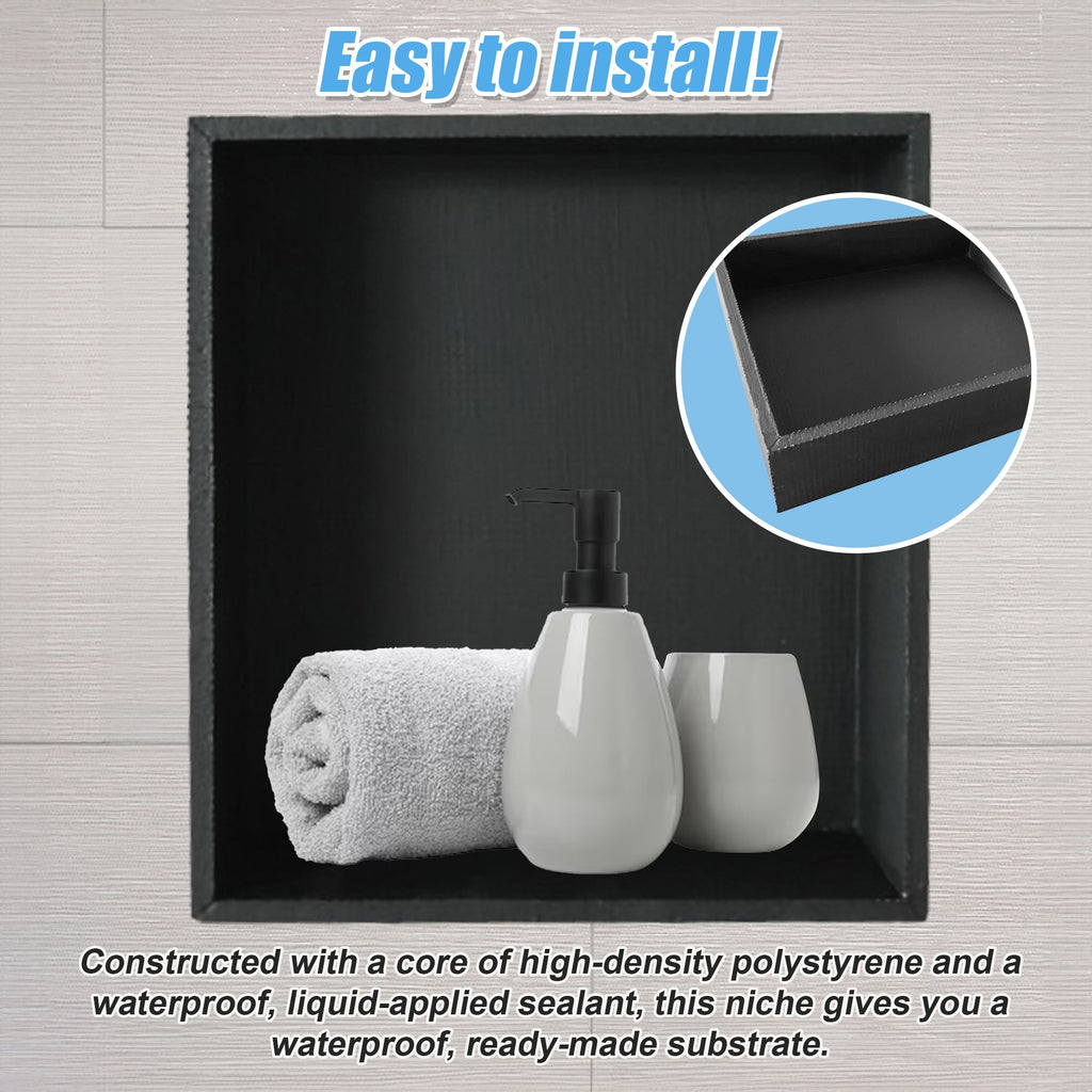 Constructed With A Core Of High-Density Polystyrene And A Waterproof Liquid-Applied Sealant This Niche Gives You A Waterproof Ready-Made Substrate. Easy To Install And Ready To Tile Within Minutes Of Installation These Niches Provide You With A Versatile Bathroom Solution That We Guarantee Will Never Degrade Leak Or Rot.