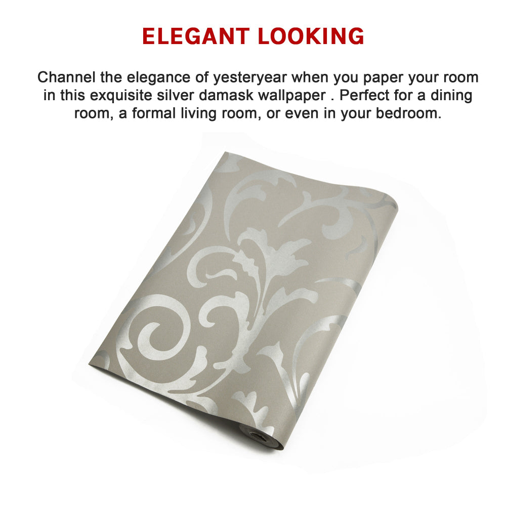 Channel The Elegance Of Yesteryear When You Paper Your Room In This Exquisite Silver Damask Wallpaper From Randy Travis Machinery. Perfect For A Dining Room A Formal Living Room Or Even In Your Bedroom This Stunning Wallpaper Will Make Your Rooms Look Like They Belong In A Mansion. Its Timeless Beauty Creates A Traditional Look Even In The Most Modern Of Homes. Use It As An Accent Wall Or Paper Your Entire Room To Give Your Room The Look Of A Turn-Of-The-Century Salon.