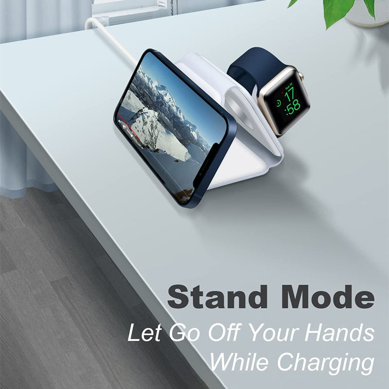 【Innovative Versatile Design】3-in-1 charger can be placed flat stacked or folded as a phone stand. Select your own way of charging. Put your iPhone 12 13 in landscape and enjoy the movie while charging.