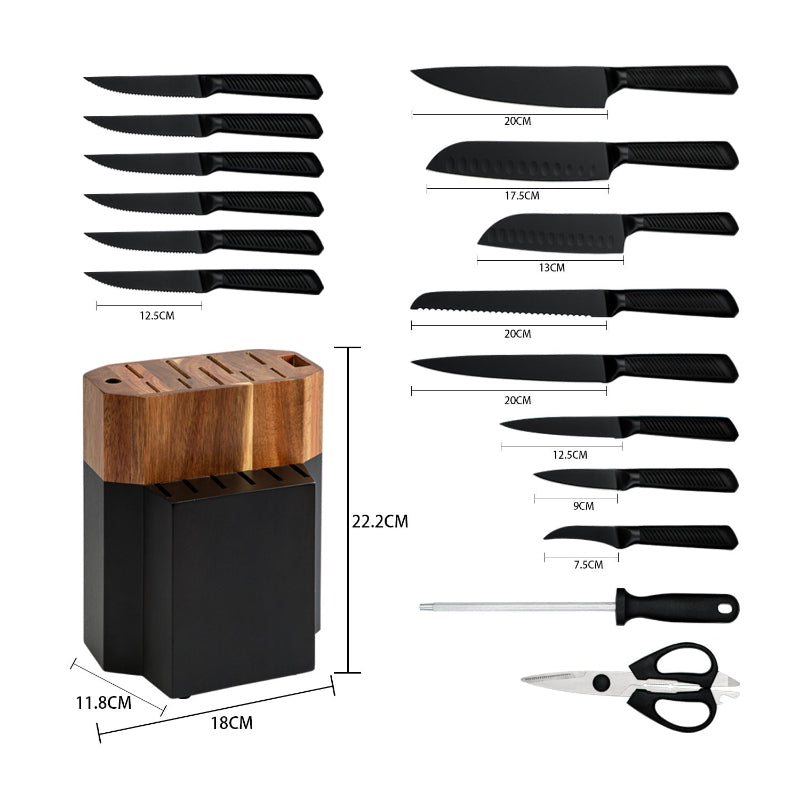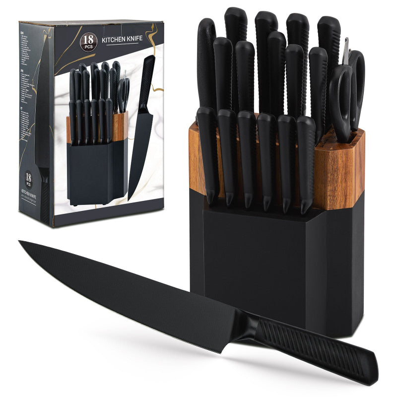 18Pc Kitchen Knife Block Set Stainless Steel Black Blades Wood Holder Knife Blocks & Storage