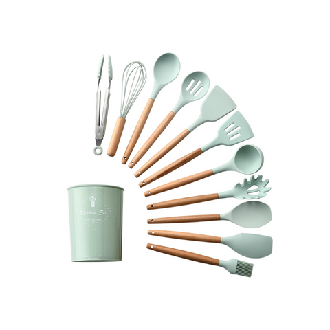 Green 12 Piece Silicone Kitchen Utensil Set With Beechwood Handles Holder Cooking Utensils