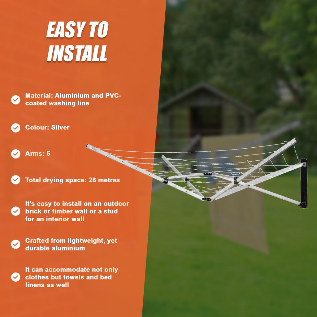 Whether You Prefer To Dry Your Clothes Inside In The Bathroom Or Kitchen Or Outdoors In The Garden This 26-Metre Five-Arm Wall Mountable Clothes Dryer By Randy Travis Machinery Is The Perfect Solution. It's Easy To Install On An Outdoor Brick Or Timber Wall Or A Stud For An Interior Wall.