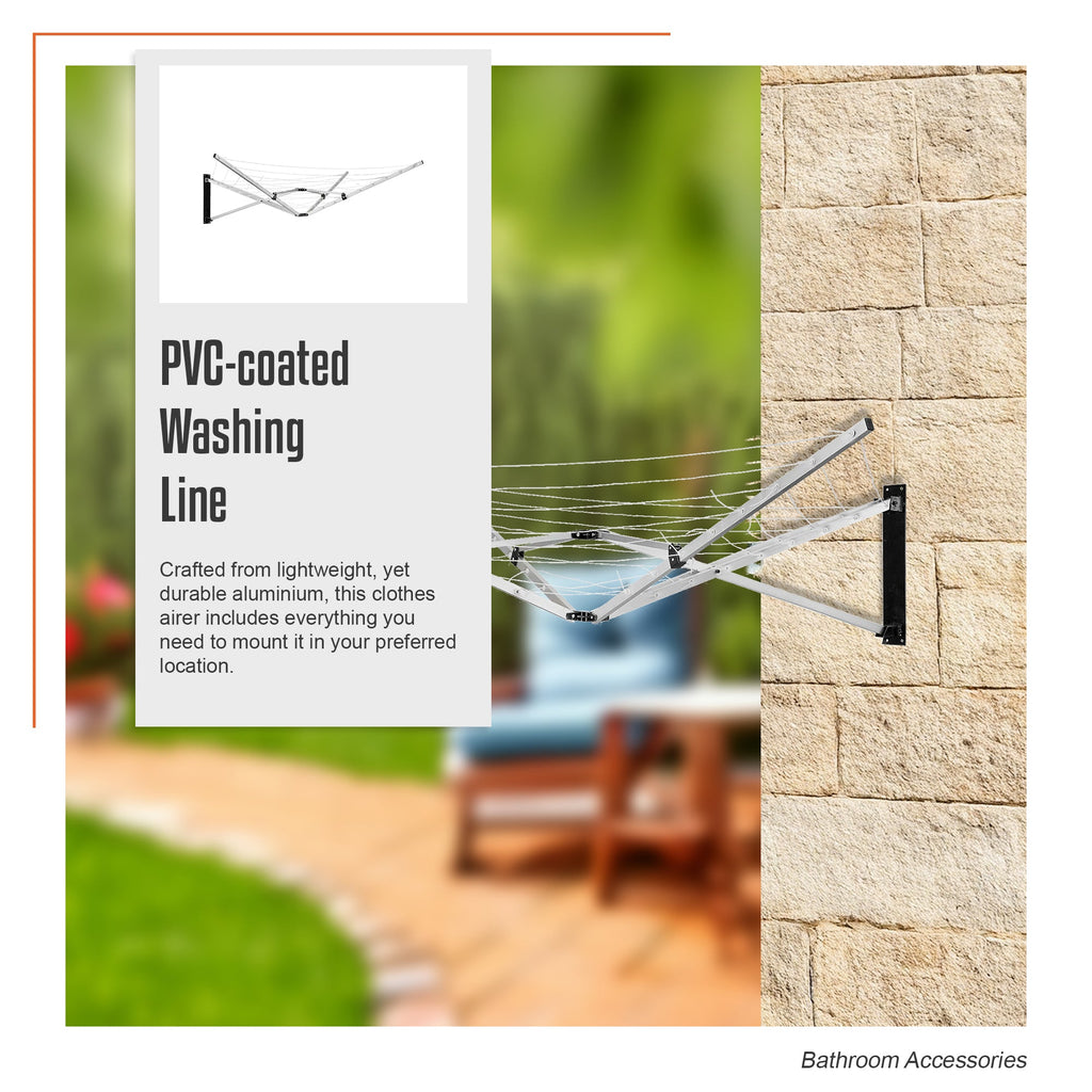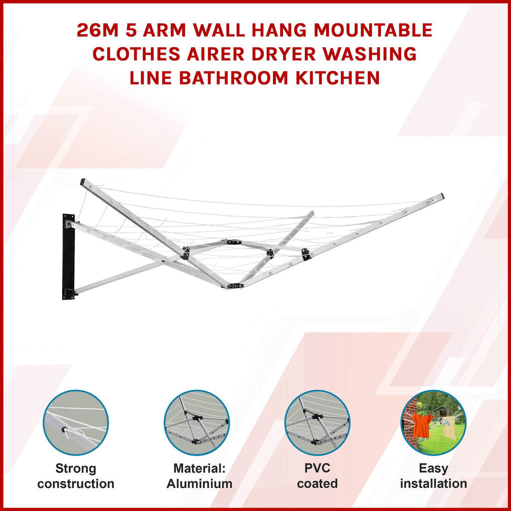 26M 5 Arm Wall Hang Mountable Clothes Airer Dryer Washing Line Bathroom Kitchen Clothes Airers