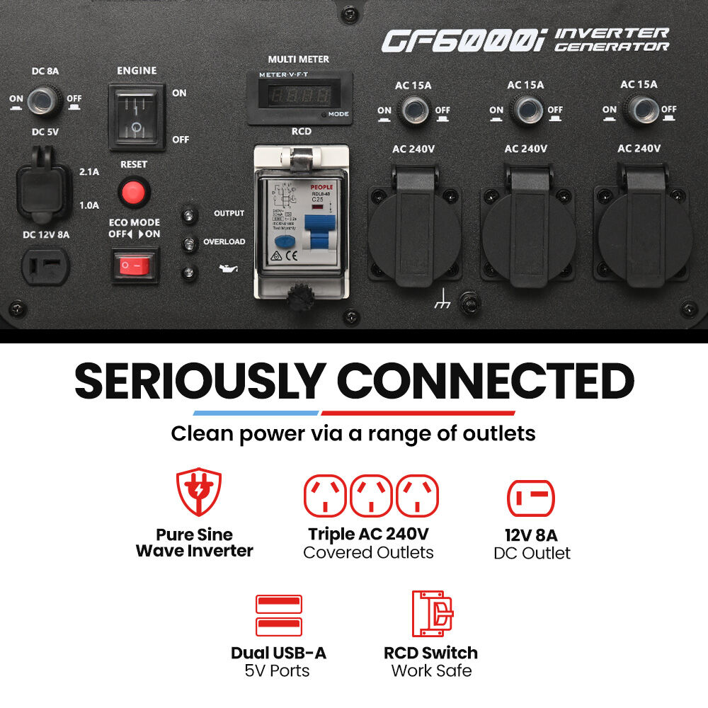 P>A Powerful 274Cc Ohv Engine Combines With Genpowers's Advanced Inverter Technology To Deliver Clean Stable Power That's Safe For Sensitive Electronics Like Laptops Phones And Medical Devices. Eco Mode Optimises Fuel Efficiency Offering Up To 9 Hours Of Runtime On A 15L Tank At 50% Load. P>Flexibility Is Built Into Its Design. Youa€™Ll Find Three 15A Australian Sockets A 12V Dc Outlet And Dual Usb Ports Giving You The Ability To Charge And Power Everything From Tools To Tech. Safety Is A Priority With Overload Low-Oil And Over-Temperature Protections Plus An Rcd Safety Switch For Added Peace Of Mind. The Brushless Copper Alternator Ensures Durability While Forced Air Cooling Keeps Everything Running Smoothly. P>Weighing Just 45Kg The Gf6000i Is Lighter Than Most In Its Class And Comes With Built-In Wheels And A Foldable Handle For Easy Mobility. Its Compact Size Fits Neatly Into Tight Storage Spaces Making It As Practical As It Is Powerful. P>Backed By A 3-Month Money-Back Guarantee And A 3-Year Warranty The Genpower Gf6000i Is The Dependable Generator Youa€™Ve Been Searching For. Whether Youa€™Re Tackling Tough Diy Jobs Supporting Light Commercial Tasks Or Preparing For The Unexpected Ita€™S Ready To Deliver. P>Dona€™T Waita€”Secure The Power You Need Today With The Genpower Gf6000ie!Ul> Li>Big 6000W Peak Starting Power And 5000W Continuous Output Li>Inverter Technology Ensures Clean Stable Power For Sensitive Electronics Li>15L Fuel Tank Offers Up To 9 Hours Of Runtime At 50% Load Li>Eco Mode Optimises Fuel Efficiency For Extended Use Li>3X 15A Australian Sockets To Power Multiple Devices Li>1X Dc 12V Outlet And Dual Usb Ports For Versatile Connectivity Li>Rcd Safety Switch For Added Electrical Protection Li>Overload Low Oil And Over-Temperature Safety Features Li>Fold Out Handle And 8 Inch Flat Free Wheels Li>Backed By A 3-Month Money-Back Guarantee And 3-Year Warranty (Non-Commercial Use)/Ul>