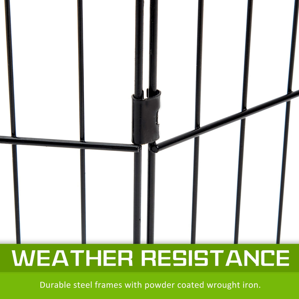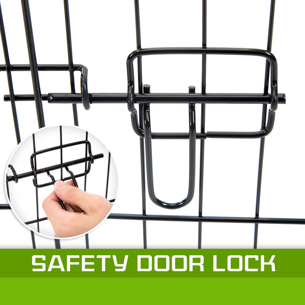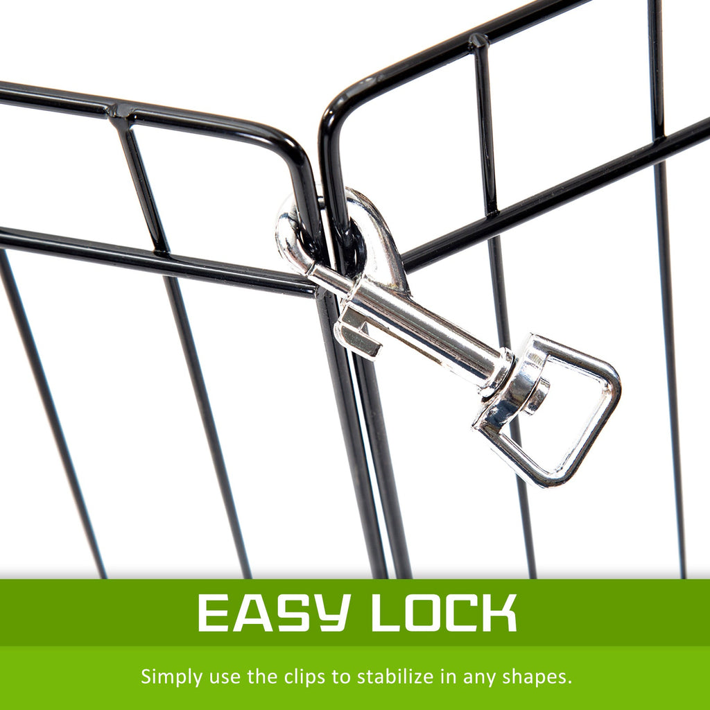 It Features As 8 Panels For Multi-Configuration Which Allows You To Turn Your Playpen Into Different Shapes. Made Of Durable Steel Frames Construction With Black Powder Coat Finish Provides Long Lasting Protection And Weather Resistance. The Access Door With Bolt Latches You Can Be Sure That Your Pet Doesn't Have The Opportunity To Run Away And The Round Edges Ensure Pet Safety.
