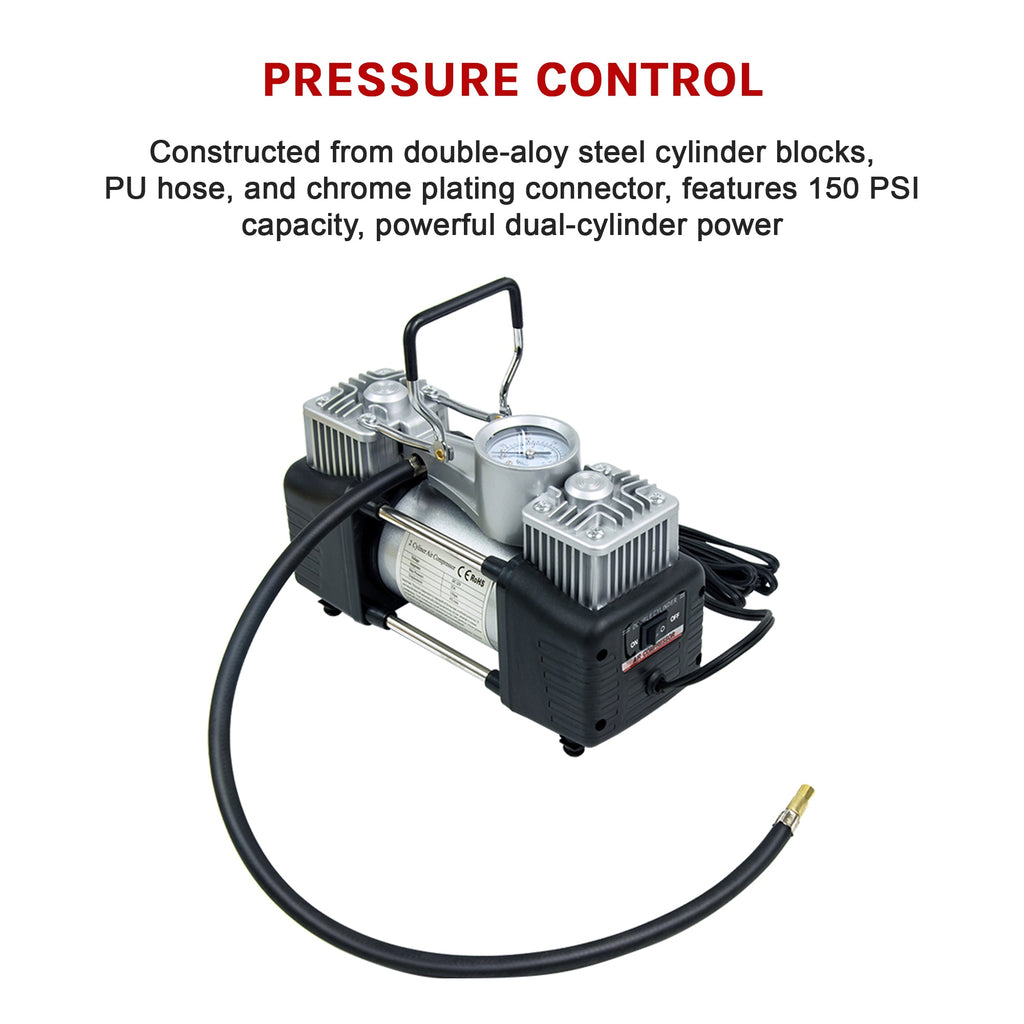 Its Working Capacity Of 150 Psi Fills Your Tyre At A Rate Of 85 Litres Per Minute. With Its Dual-Cylinder Power It Can Easily Accommodate Tyres On Even Larger Vehicles Such As 4X4s. A Bleed Valve Protects The Compressor By Releasing The Pressure Built Up Inside The Tank From Air Or Other Gases. Keep It In Your Car's Boot For Easy Access When You Travel. It Comes With Its Own Carry Bag So You Can Take It Along With You Wherever You Go. Its Top-Quality Construction Ensures That It Will Last For Years To Come. Don't Wait To Protect You And Your Family From The Hassle And Danger Of A Flat Tyre. Order Your Air Compressor Today
