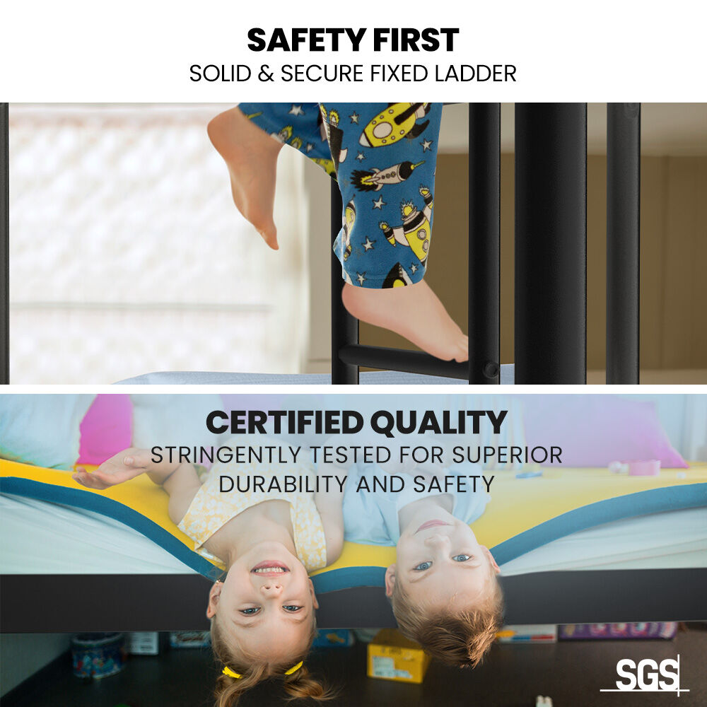 The strong tubular metal frame has a matte dark grey non-rust finish with matching fasteners #8211;so this bunk bed not only looks great but is also built to last! Soft rubber feet ensure that the bed can be placed on any floor type without the risk of scratching. With Safety in mind this bunk bed has no sharp edges and smooth welded joints. It also features a solid and secure fixed ladder that is easy to climb without the wobbles of other less sturdy bunk beds.