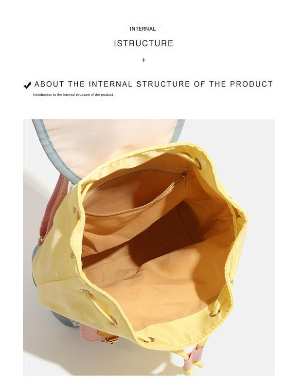 • Trendy Colorblock Design: Eye-Catching Mix Of Cheerful Colours (Yellow Pink Light Blue Cream) With Adorable Front Pocket And Patch Details For A Youthful Chic Vibe.