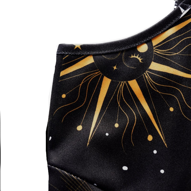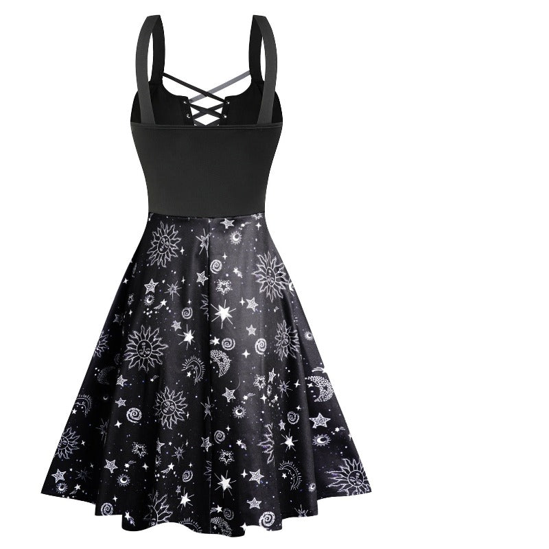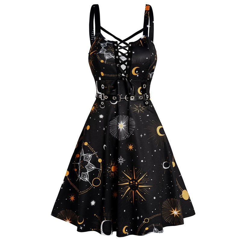 Summer Sun Moon Star Print Dress Lace Up Grommet Buckle Strap Crisscross High Waisted Fashion Mini Robe For Women Dresses