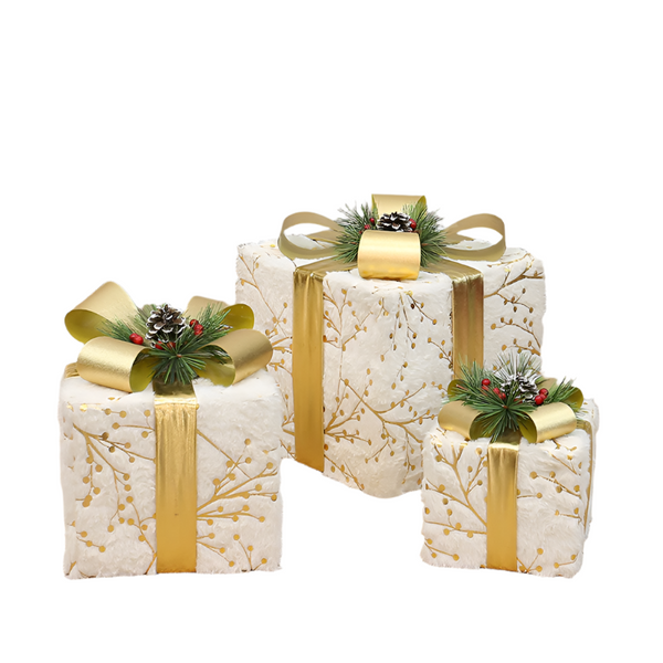 Elevate your holiday decor with this exquisite set of 3 decorative Christmas gift boxes featuring luxurious gold ribbons pine cones and red berries. Each box is elegantly wrapped in a plush white fabric with golden accents measuring 15cm 20cm and 25cm to create a sophisticated holiday . Ideal for under the Christmas tree on mantels or as part of your indoor festive display these gift boxes add a touch of elegance and warmth to any space.