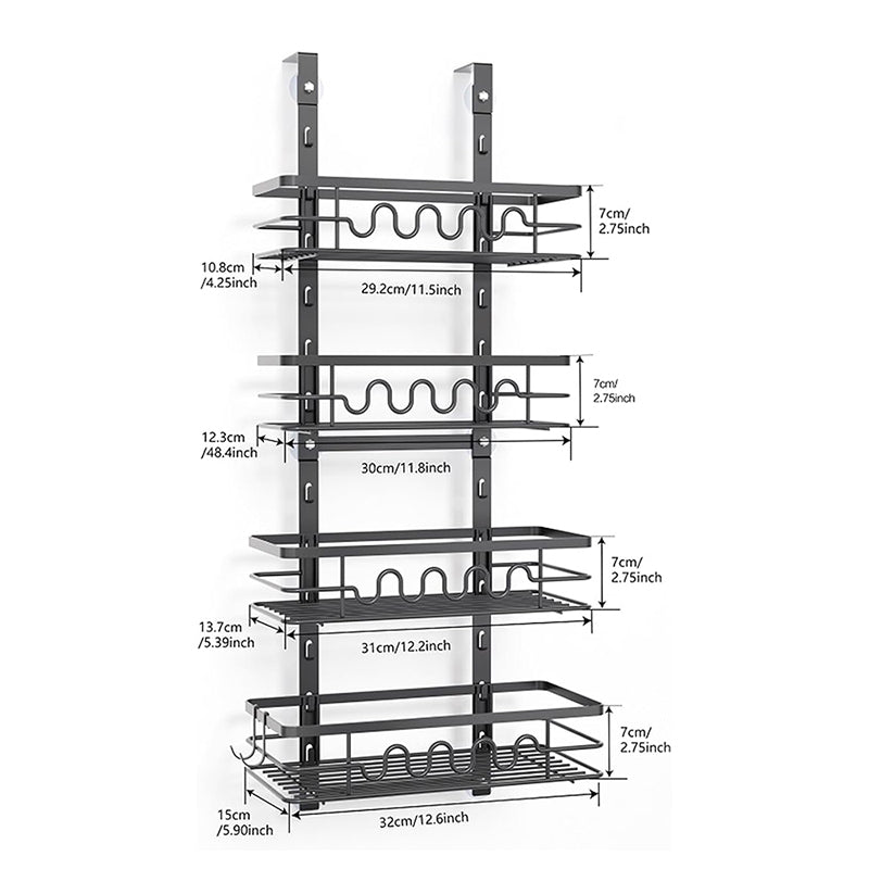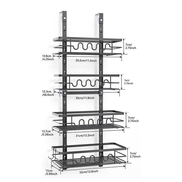 - Heavy-Duty Metal Material: This Upgraded Door Storage Organizer Is Made Of Strong And Resistant Metal Material The Surface With A High-Quality Black Powder-Coated Which Is Waterproof And Rustproof Easy To Clean. The Hanging Baskets Are Also Good In Load-Bearing Stability It Holds 10 Kg Per Rack And 40 Kg On 4 Tiers. Comes With 4 Suction Cups And 4 Strong Adhesive Eva Pads Can Be Firmly Fixed On The Door To Enhance Stability Prevent Scratching And Swaying When Opening Or Closing.