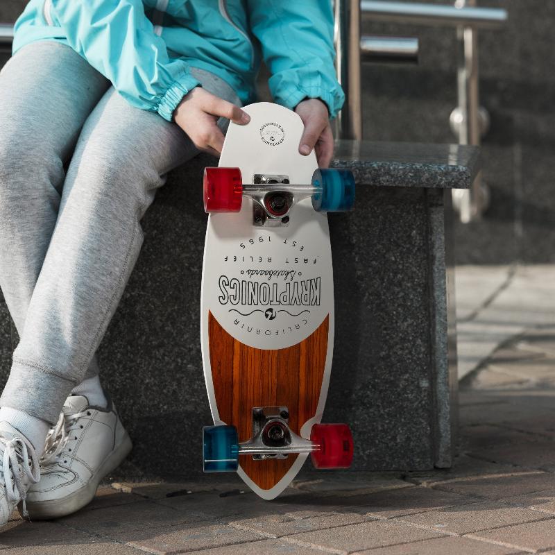 With The Kryptonics Mini Fat Cruiser Board Experience Urban Adventures Like Never Before! Crafted For Gnarly Carving Through The Streets This Cruiser Features A 23In X 7.75In Mini Fat Wood Deck Ensuring Stability And Control With Its Single Kicktail Design. Grip The Road Confidently With Its 7-Ply Maple Construction And 2Pc Split Grip (80Ab) Tape While The Patented Wheel Lock Keeps Your Board Steady And Prevents Unwanted Movement During Storage. And With Carbon Steel Abec 3 Bearings Youll Find Yourself Gliding Effortlessly On Concrete Terrain!