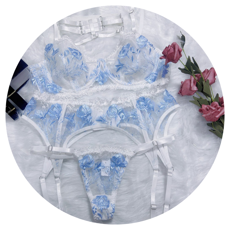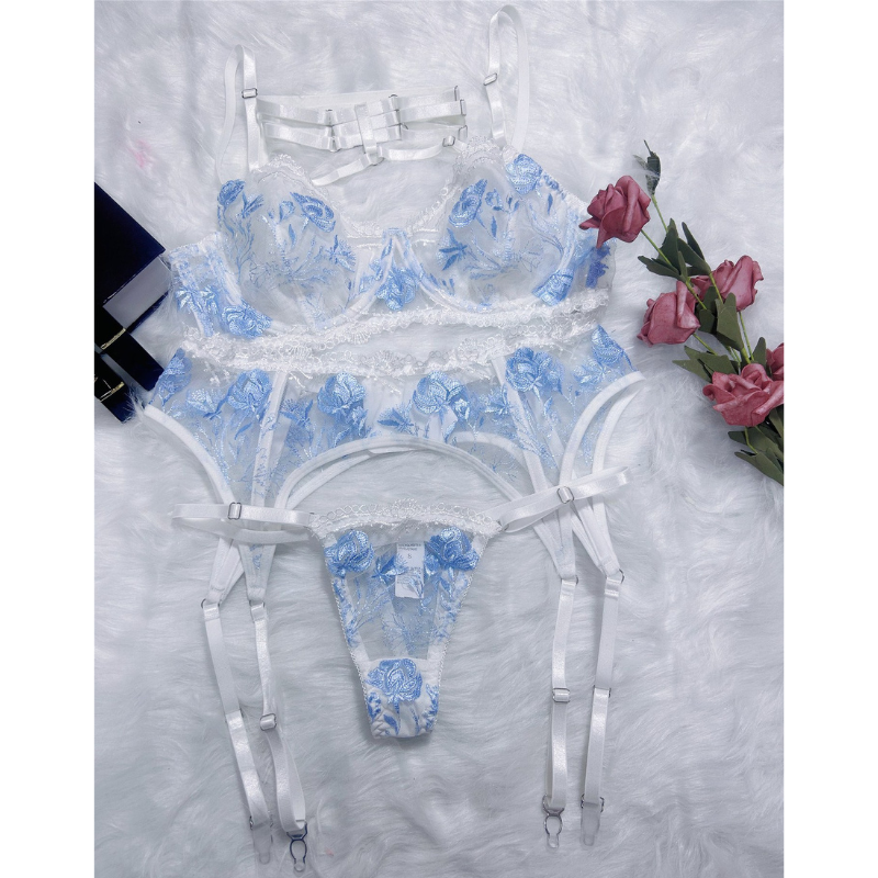 • Set includes a collar bra garter belt and underwear for a complete coordinated look.