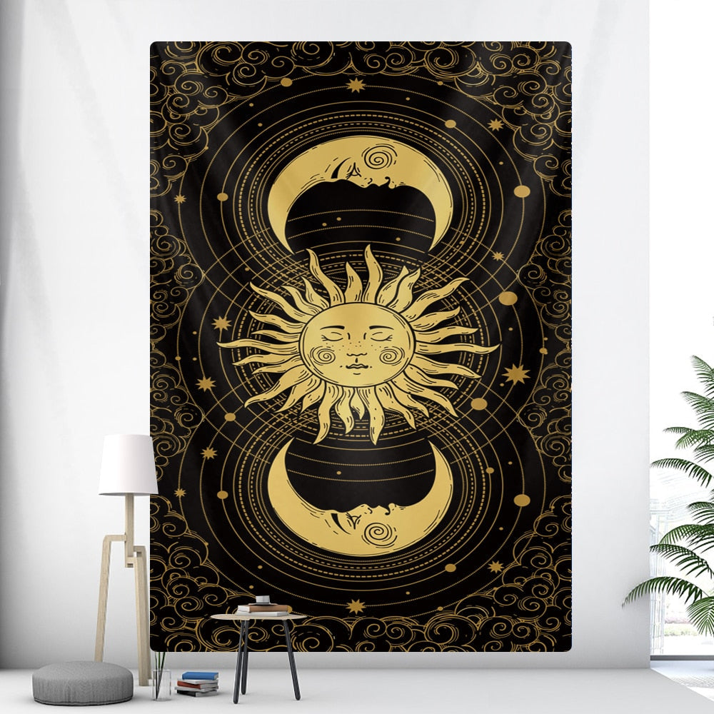 • 1 X Tapestry Black Yellow Sun Moon 200X150 Cm Tarot Card Psychedelic Scene Art Hippie Bohemian Decoration Sheets