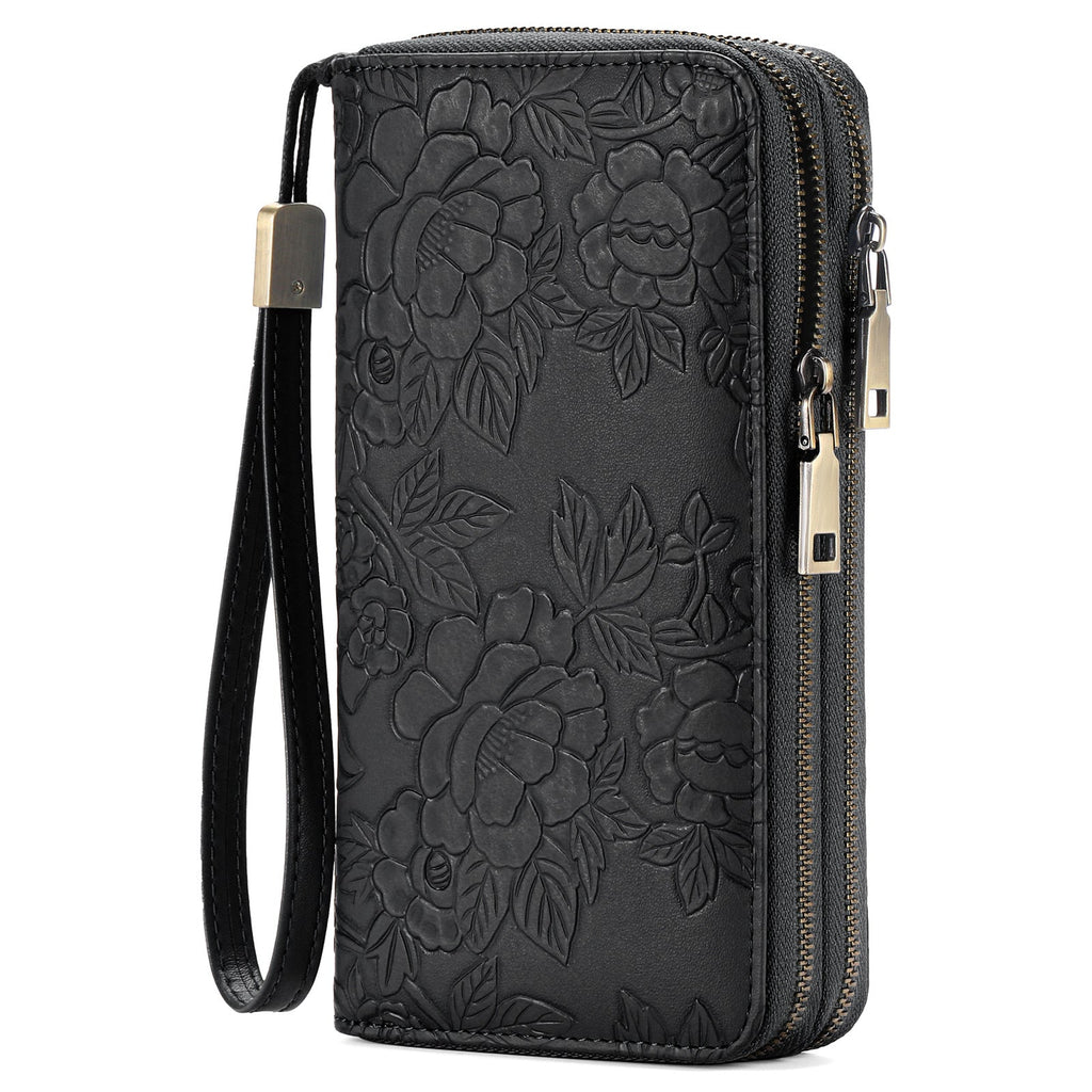 Stay Organized In Style With This Black Embossed Design Large Capacity Vegan Leather Wallet. Crafted From High-Quality Eco-Friendly Vegan Leather With A Beautiful Embossed Floral Design This Wallet Is Perfect For Those Who Want Both Fashion And Function. It Offers Ample Storage With Multiple Compartments For Cards Cash And Coins Along With The Added Security Of Rfid Blocking Technology. The Detachable Wristlet Provides Versatile Carrying Options Making It An Ideal Choice For Daily Use.