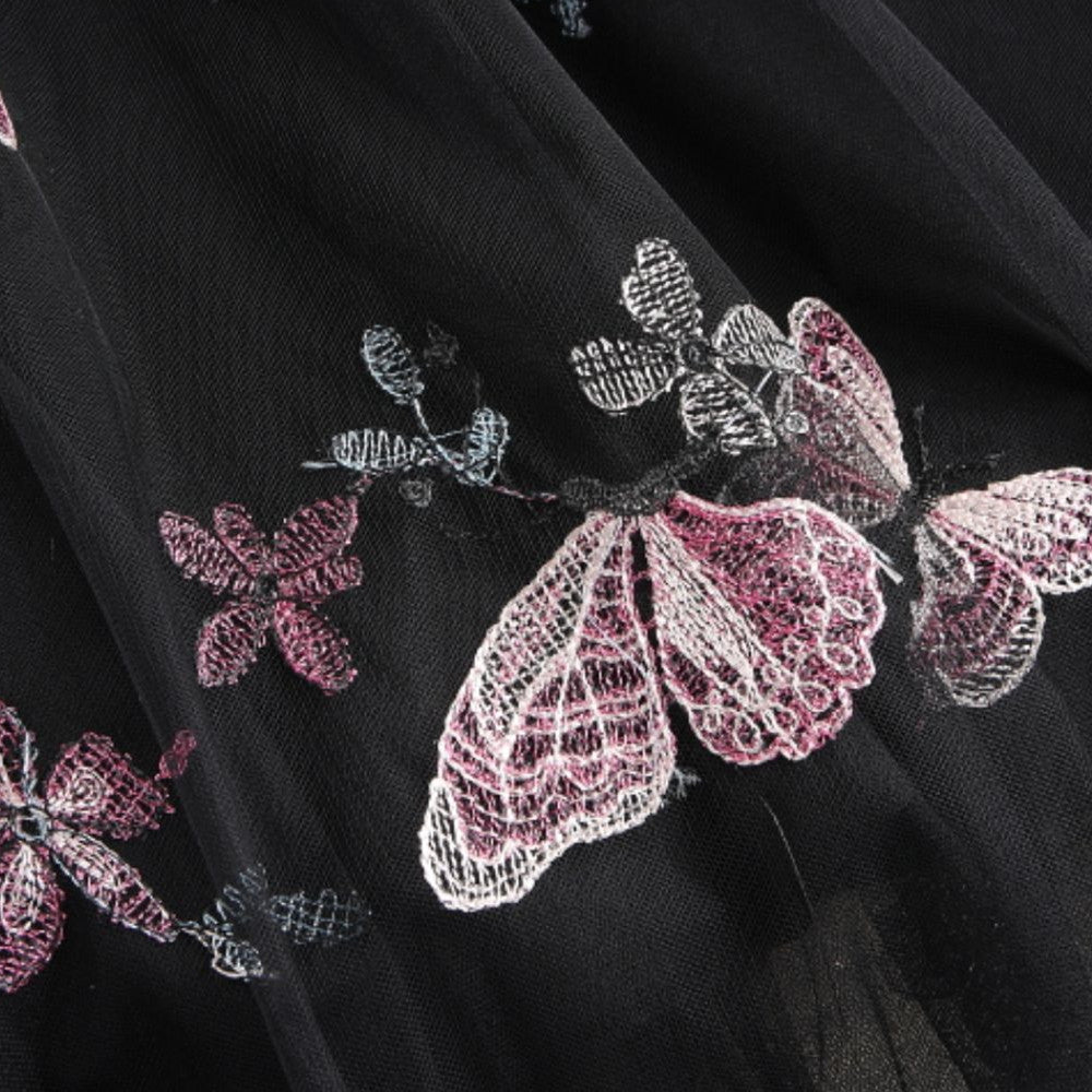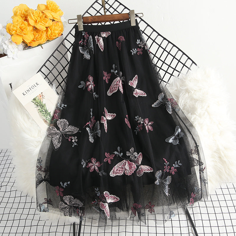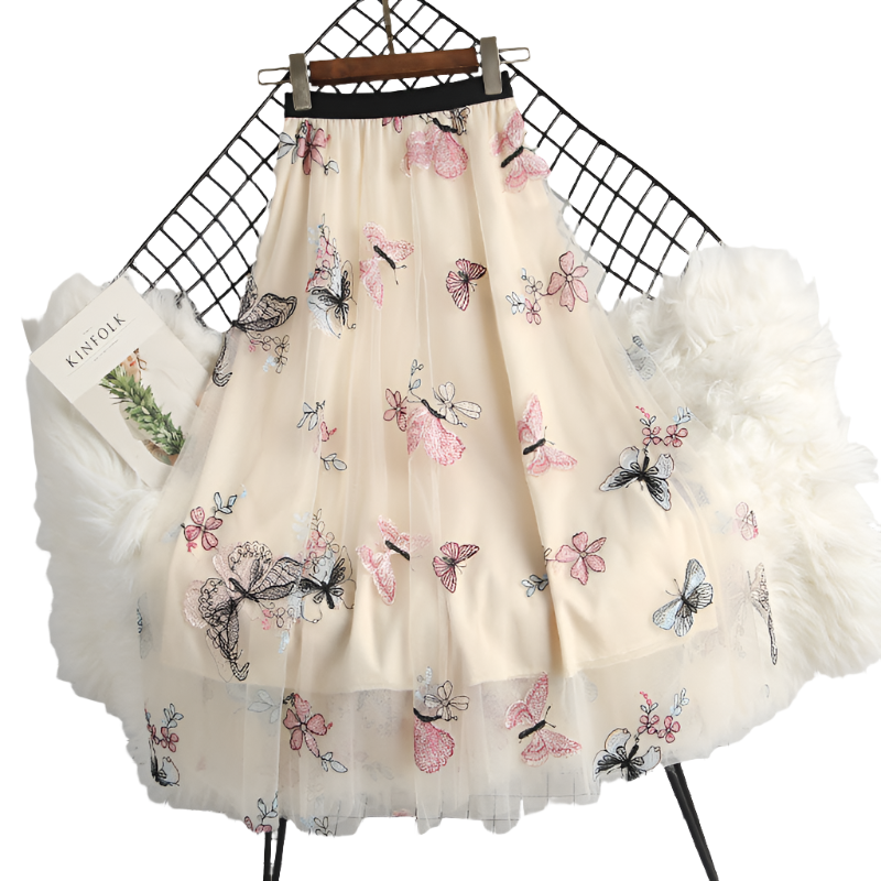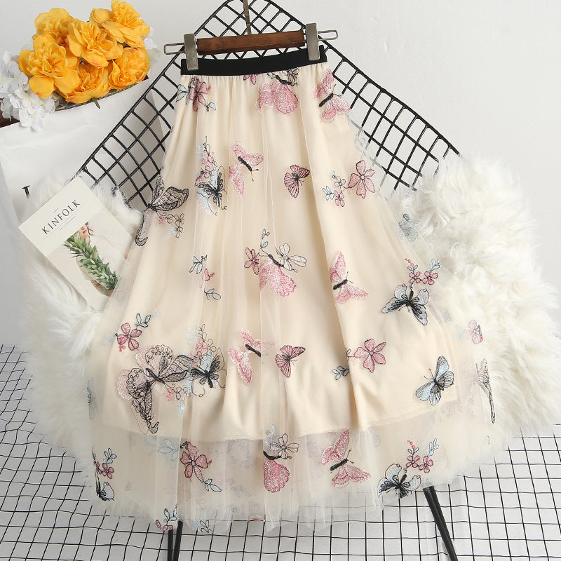 Embroidered Floral Butterfly Gauze Skirt High Waist White Apricot Black Women's Clothing Skirts