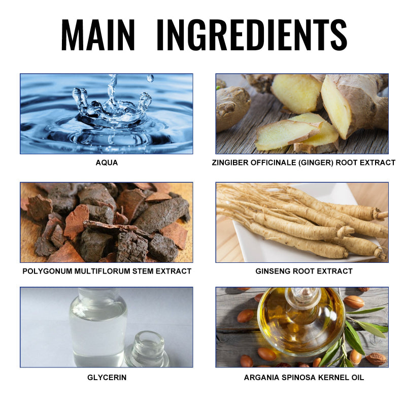 - Main Extracts: Zingiber Officinale (Ginger) Root Extract Polygonum Multiflorum Stem Extract Ginseng Root Extract