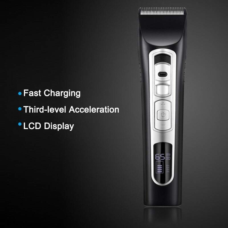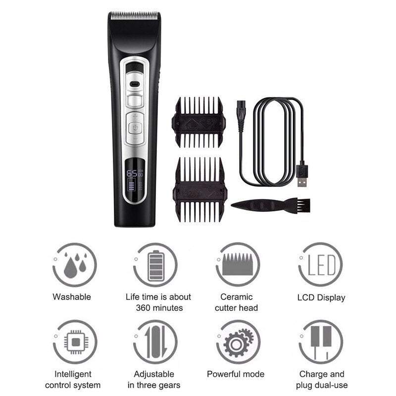 Features: Extremely Powerful Whisper Quiet: This Hair Trimmer Is Ultra-Quiet With Precision Ground Blades That Stay Sharp Longer. Ideal For Self-Cuts: This Clipping Kit Is Best For Self-Haircuts Including Detailing And Touch-Ups Around The Ears Necklines Sideburns And Head. Lcd Display Working Status Is Clearly Visible. Titanium Alloy Ceramic Blade Is Sharp And Durable And It Also Can Avoid Burning Hot. Fast Charging In 1.5 Hours. Fully Charged For Up To 6 Hours Of Use. Exquisite Appearance Comfortable Handle Feeling And Low Noise. Three Levels Of Motive Power Suitable For Adults Children Cold Men And Also Pets.