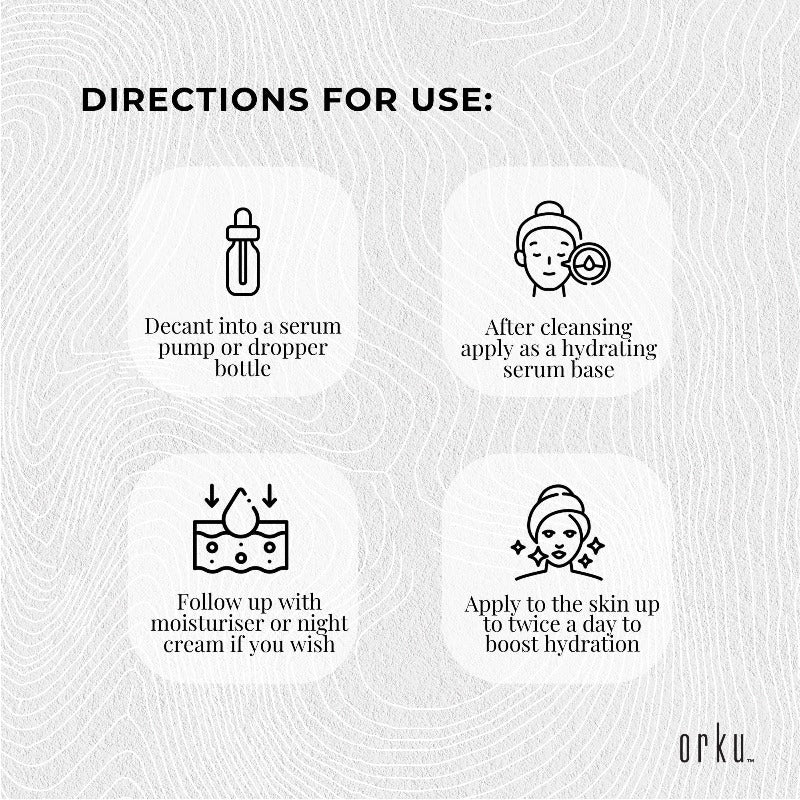 Directions For Use:Decant Into A Serum Pump Or Dropper Bottle And Use After Cleansing As A Hydrating Serum Base. You Can Then Follow Up With Moisturiser Or Night Cream If You Wish.