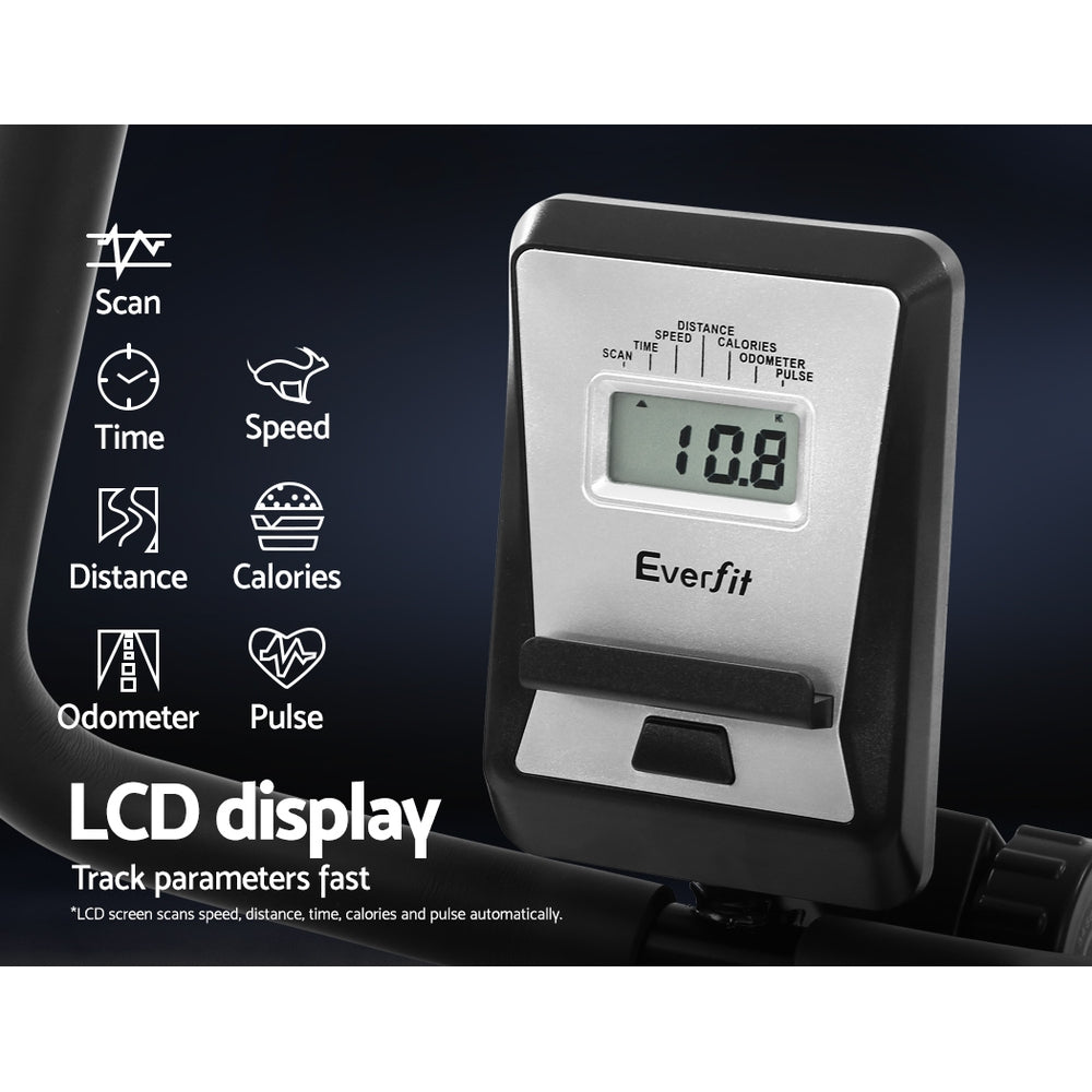Get an effective workout in the comfort of your home while watching TV or listening to your favourite music. Our Everfit Recumbent Exercise Bike is just perfect to have all these at once. Designed for people who prefer a low or non-impact exercise regimen our recumbent bike provides adequate exercise for the body without causing undue stress and strains on your joints and back. The relaxed seating position actually allows you to balance your body weight better and get your legs and heart to work together in tandem for better blood flow. The LCD display also helps to track parameters easily to let you monitor your health while exercising. The bike itself is constructed of an -strength power-coated steel frame for durability and rust resistance. With up to eight resistance levels the bike can be adjusted for the desired exercising intensity to suit your workout. Plus the magnetic flywheel is smooth and runs almost friction-free. Other features include an seat length wide and comfortable seat and non-slip protective feet. Not least the recumbent bike is also easy to transport with two handy wheels for hassle-free moving./p>