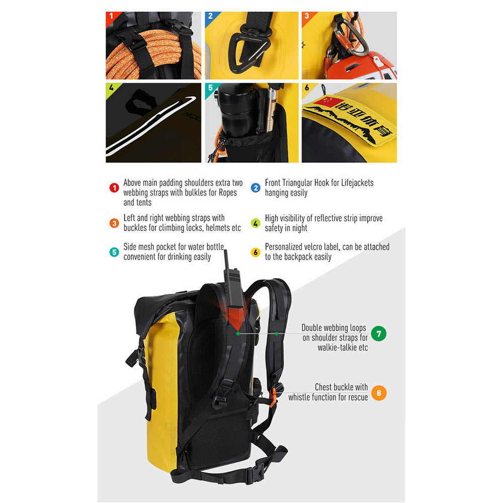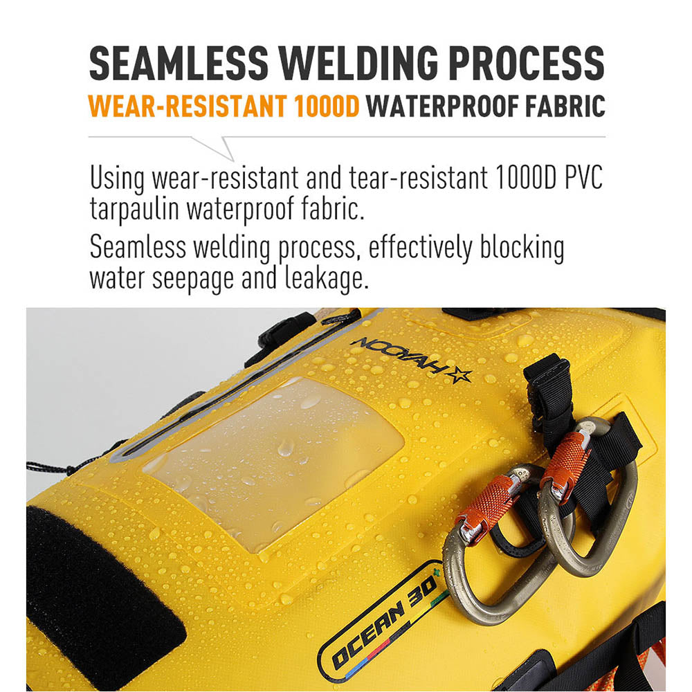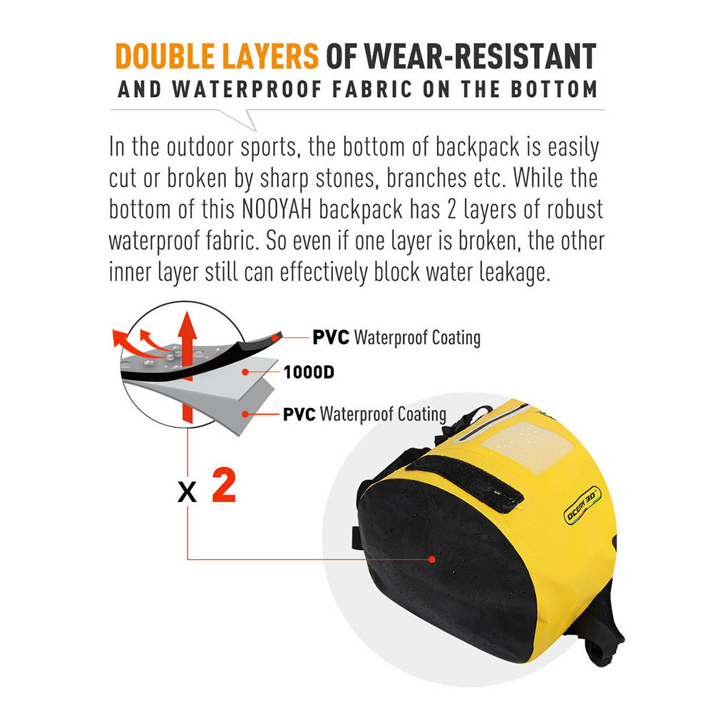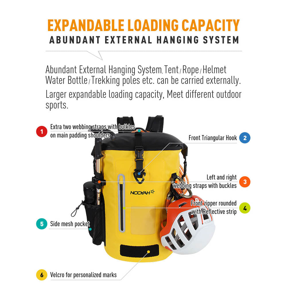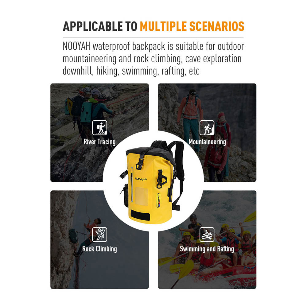 NOOYAH's waterproof cycling and outdoor sports backpack features welded seam technology with a roll top closure to the main pack creating a completely waterproof main compartment for your items.