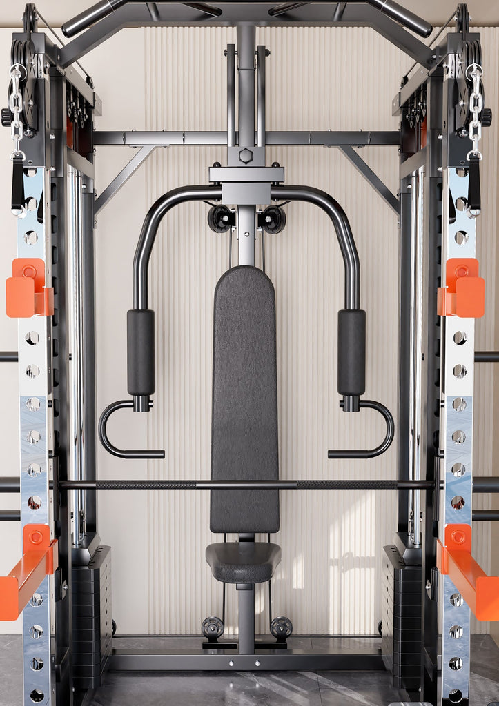 Smartfit M1 Ultra Is The Ultimate Machine For Home Gym And Light Commercial Use. It Is The Combination Of Cable Crossover Station Chin-Up Station Smith Machine And Squat Rack With A Huge Variety Of Workout Stations Targeting Upper And Lower Body Exercises. This All-In-One Machine Is Designed With An Ultra Smooth Linear Bearing Smith System Heavy Duty Frame Pulleys And Cables As Well As The Back 30Kgs Weight Attachments Which Also Allows Both Size Of Extra Weights And Enables Flexibility To Train Multiple Groups Of Muscles On The Full Body.