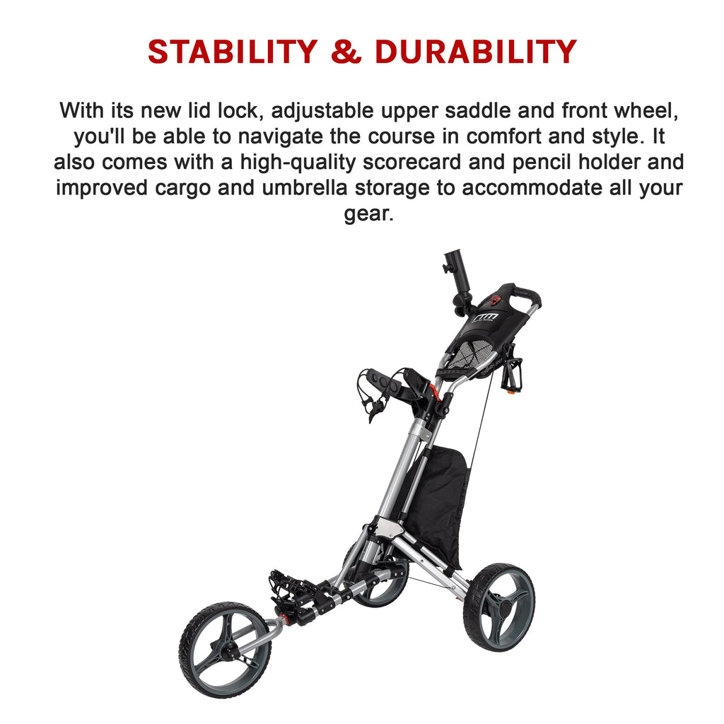 Ul>Li> Safety:The Ultimate In Stability And DurabilityLi> Versatility: Its Four Accessory Mounts Umbrella Mount And Bracket Accommodate All Your Golfing Gear Whenever And Wherever You Need ItLi> Improved Design: Our Cart's Large Console Features Space For Your Scorecard Pencil Ball And Tee Holders As Well As An Ample Storage NetLi> Adjustability: Its Customisable Upper And Lower Saddle And Handlebars Are Designed For Your Comfort And Easy UseLi> Superior Brakes: With Its Front Wheel-Engaged Handle Brake You'll Enjoy Seamless Operation Around The GreenLi> Security:Storage Console Lid LockLi> East Of Use: Durable Silicone StrapsLi>Lightweight: 8.7Kg/Ul>