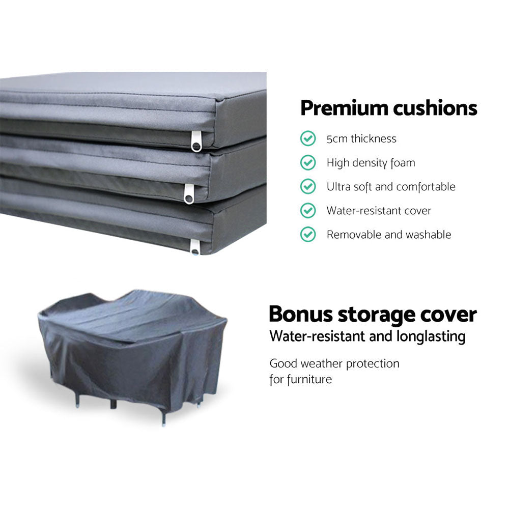 Dine in exquisite style with our elegant Gardeon Outdoor Dining Set. Finished in UV-resistant PE rattan with a strong and sturdy aluminium frame construction for both chairs and table this multi-piece dining set is designed to please as well as stand up to the weather elements. The chairs have a sleek and contoured profile with 5cm thick high density foam cushions to ensure comfort and style are always in place. And the spacious dining table features a 5mm thick tempered glass top for safe and hardy use. Not least a water-resistant cover for the entire ensemble is also included to keep it clean always.