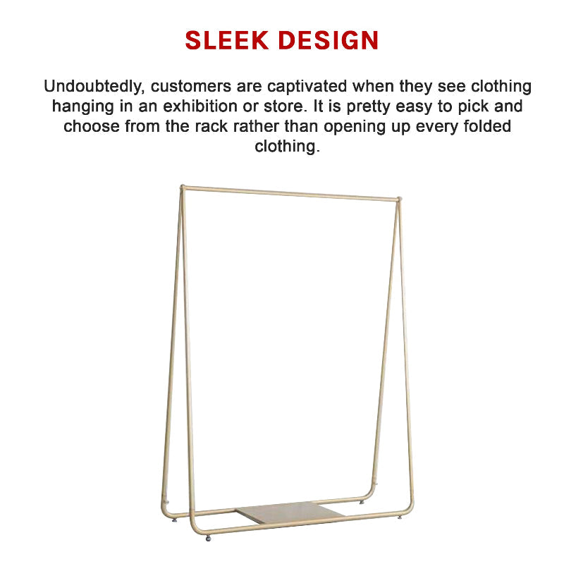 Elevate the elegance of your fashion display with this stunning Gold Clothing Retail Shop Commercial Garment Display Rack. Whether you're a boutique owner market stallholder or just looking for a luxe alternative to a wardrobe at home this sleek rack adds instant sophistication. The lustrous gold finish and minimalist frame draw attention to your garments making it easier for customers—or you—to browse effortlessly. Perfect for showcasing everything from high-end dresses to everyday casuals with a bottom shelf that’s ideal for shoes or accessories.